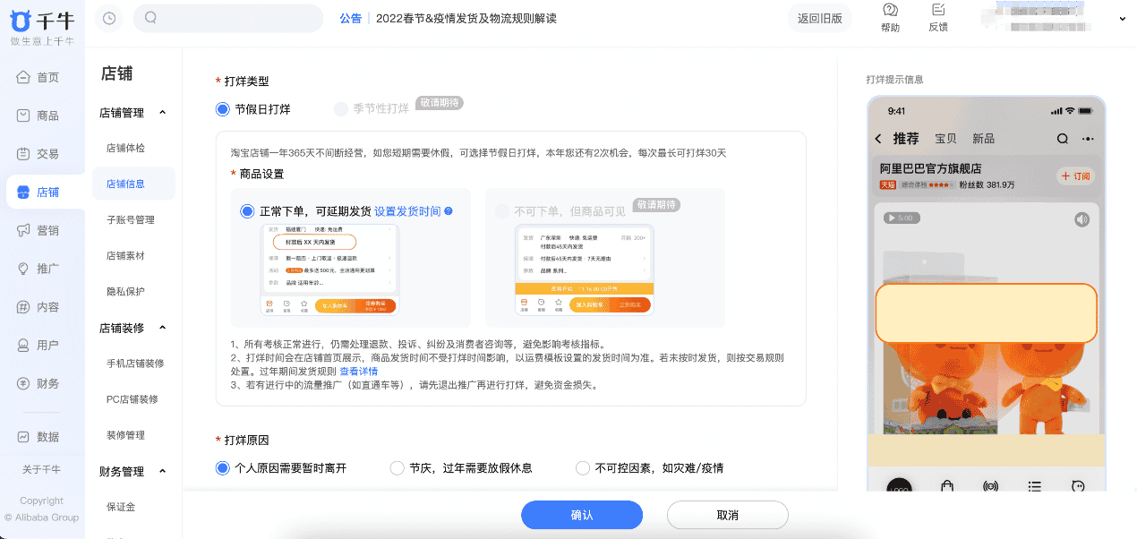 1、一年仅支持两次节日打烊申请(自然年),且每次不得超过三十天,请谨慎操作设置与解除。