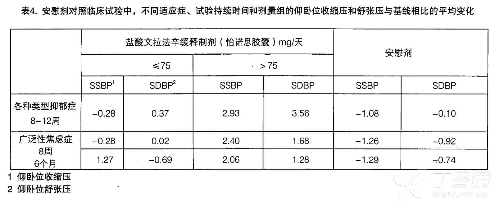 在安慰剂对照的上市前研究中,平均血压的变化见表 4(仰卧位收缩压和舒张压的平均变化)。在不同的适应症间,在盐酸文拉法辛缓释制剂(怡诺思胶囊)治疗的患者中证实仰卧位收缩和舒张压与剂量的增加相关。