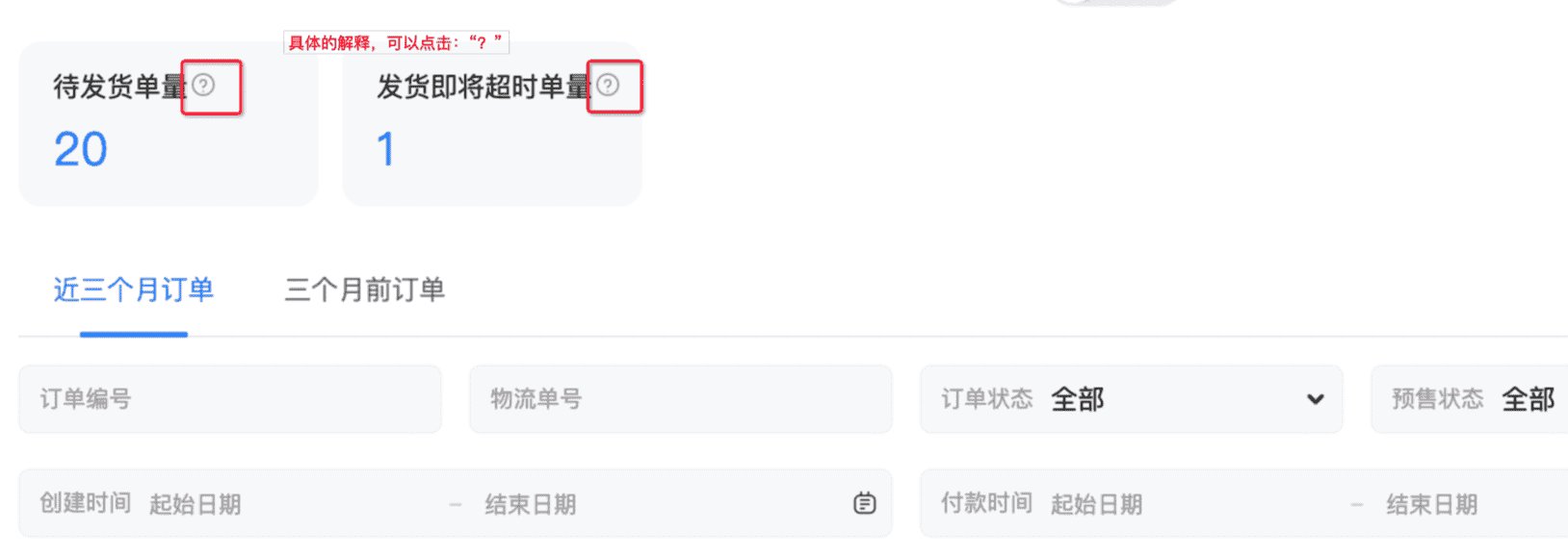 2、此处和发货规则中赔付逻辑不一样。发货规则中的超时指【揽收时间】如超过发货合约时间,则为发货超时,此处为【订单状态为等待发货】且距离发货时间小于12小时的订单统计,仅作为待发货提示,需注意区别。