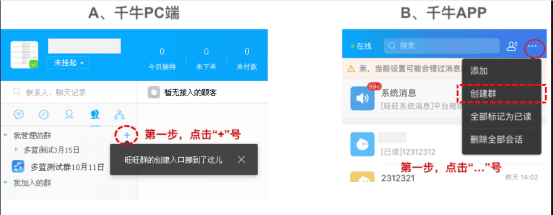 【千牛APP】消息TAB下,点击右上角【…】,点击【创建群】即可,更新至最新版本即可;