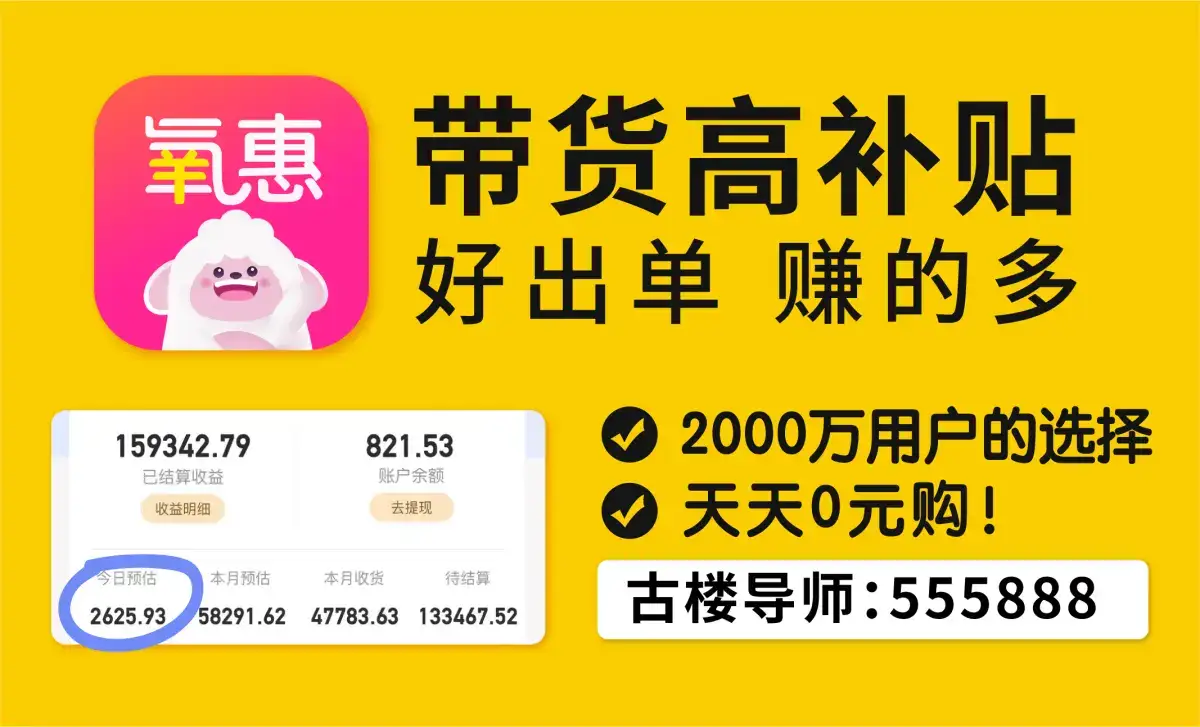 氧惠APP是与以往完全不同的抖客+淘客app!2024全新模式,我的直推也会放到你下面。主打:带货高补贴,深受各位带货团队长喜爱(训练营导师每天出单带货几万单)。注册即可享受高补贴+0撸+捡漏等带货新体验。送万元推广大礼包,教你如何1年做到百万团队。古楼导师氧惠邀请码555888,注册送万元推广大礼包,教你如何1年做到百万团队。我整理了一份《最新12种引流方法》,关注「善士思维笔记」回复:善士,即可领取哦。