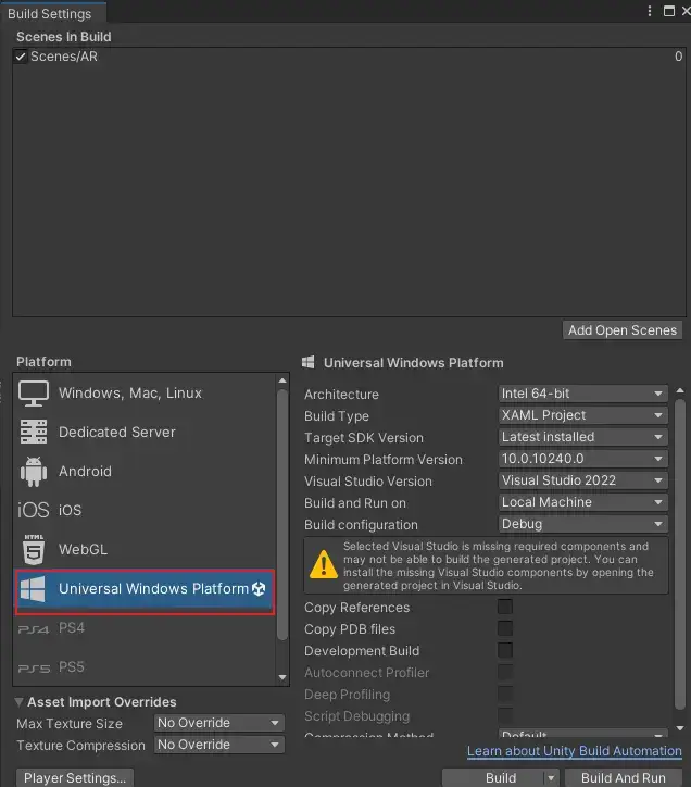 要实现AR项目在Windows端(平板、笔记本等)使用,只能发布成UWP,再打包发布安装包。