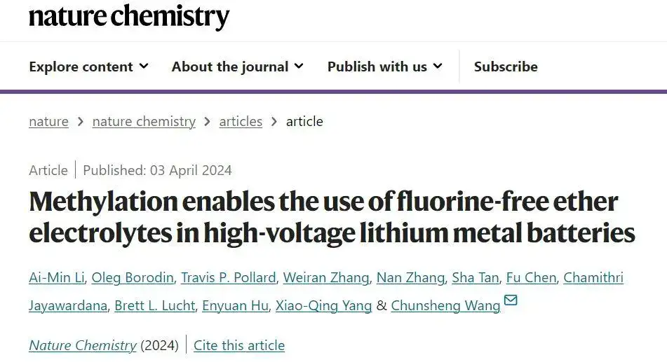相关成果以《Methylation enables the use of fluorine-free ether electrolytes in high-voltage lithium metal batteries》为题发表在《Nature Chemistry》。