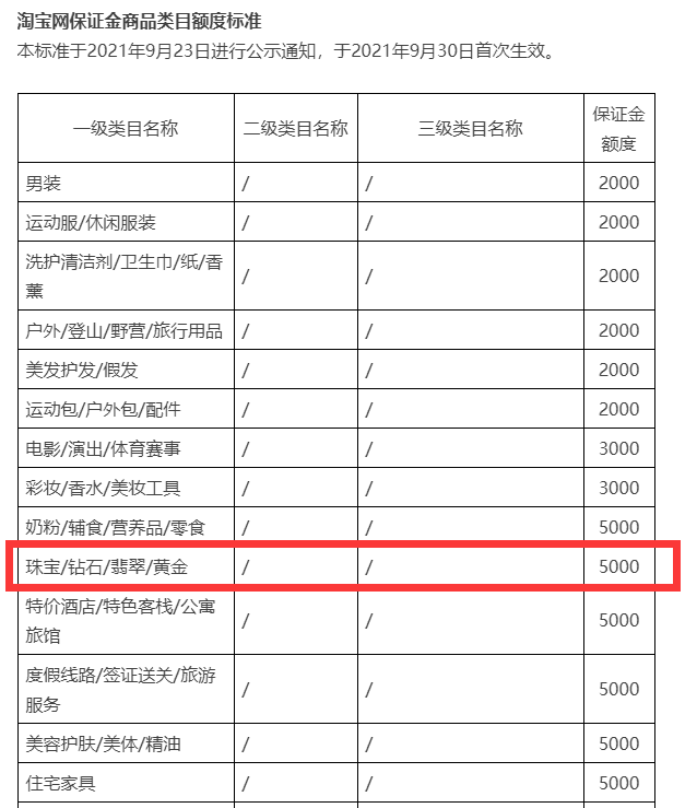 举例:若上个月出售的商品有最高要求1w保证金的类目商品,则这个月的保证金额度要求为1w,下次调整为下个月根据本月出售商品类目再做调整。