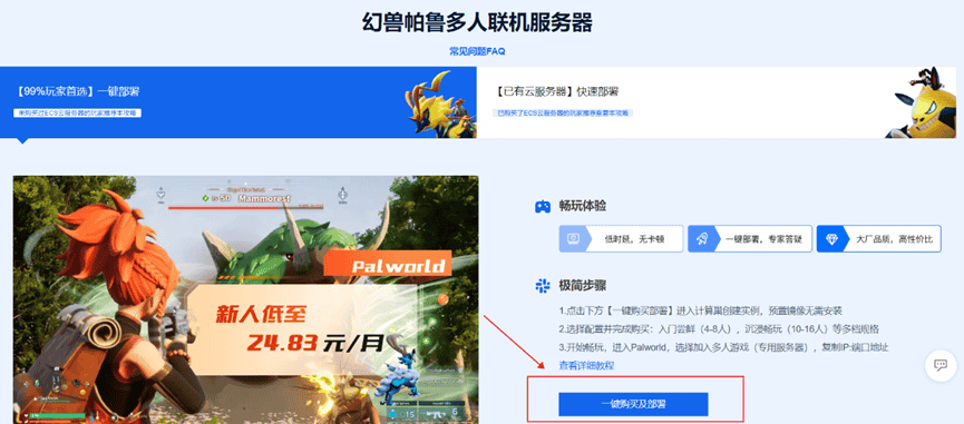 登录成功后向下滑,点击幻兽帕鲁多人联机服务器中的“一键购买及部署”,进入计算巢创建实例。