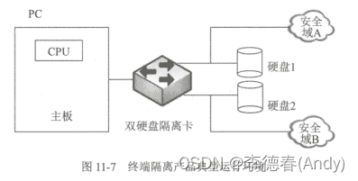 把单一硬盘分隔成不同的区域,单硬盘内外分区技术将单台物理 PC 虚拟成逻辑上的两台 PC, 使得单台计算机在某一时刻只能连接到内部网或外部网。