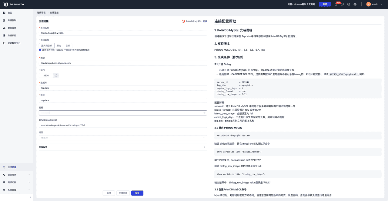 更多详情,参见《TapData 帮助文档-连接数据源-云数据库 PolarDB MySQL》: