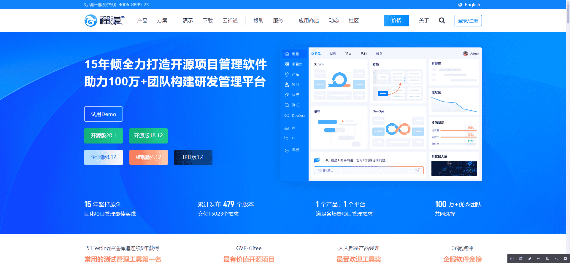 禅道(ZenTao)是一款开源的项目管理软件,专门为敏捷开发和团队协作而设计。它提供了全面的项目管理功能,包括需求管理、任务管理、缺陷跟踪、测试管理、文档管理等,旨在帮助团队高效地进行项目规划、执行和交付。禅道目前可以提供全生命周期的项目管理解决方案、DevOps一体化解决方案、自动化测试解决方案,让每一个项目都可实现高效管理。