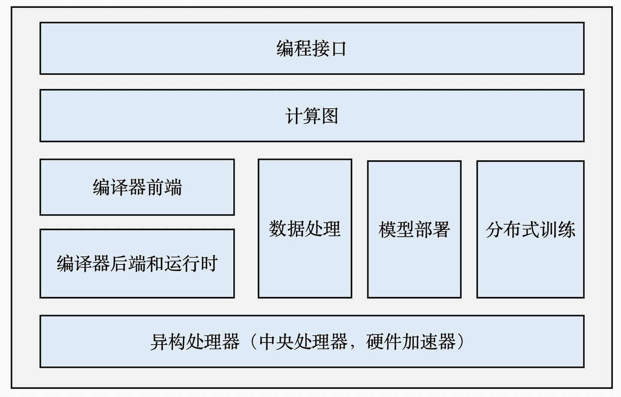 为了支持在不同应用中高效开发机器学习算法,人们设计和实现了机器学习框架(如TensorFlow、PyTorch、MindSpore等)。广义来说,这些框架实现了以下共性的设计目标: