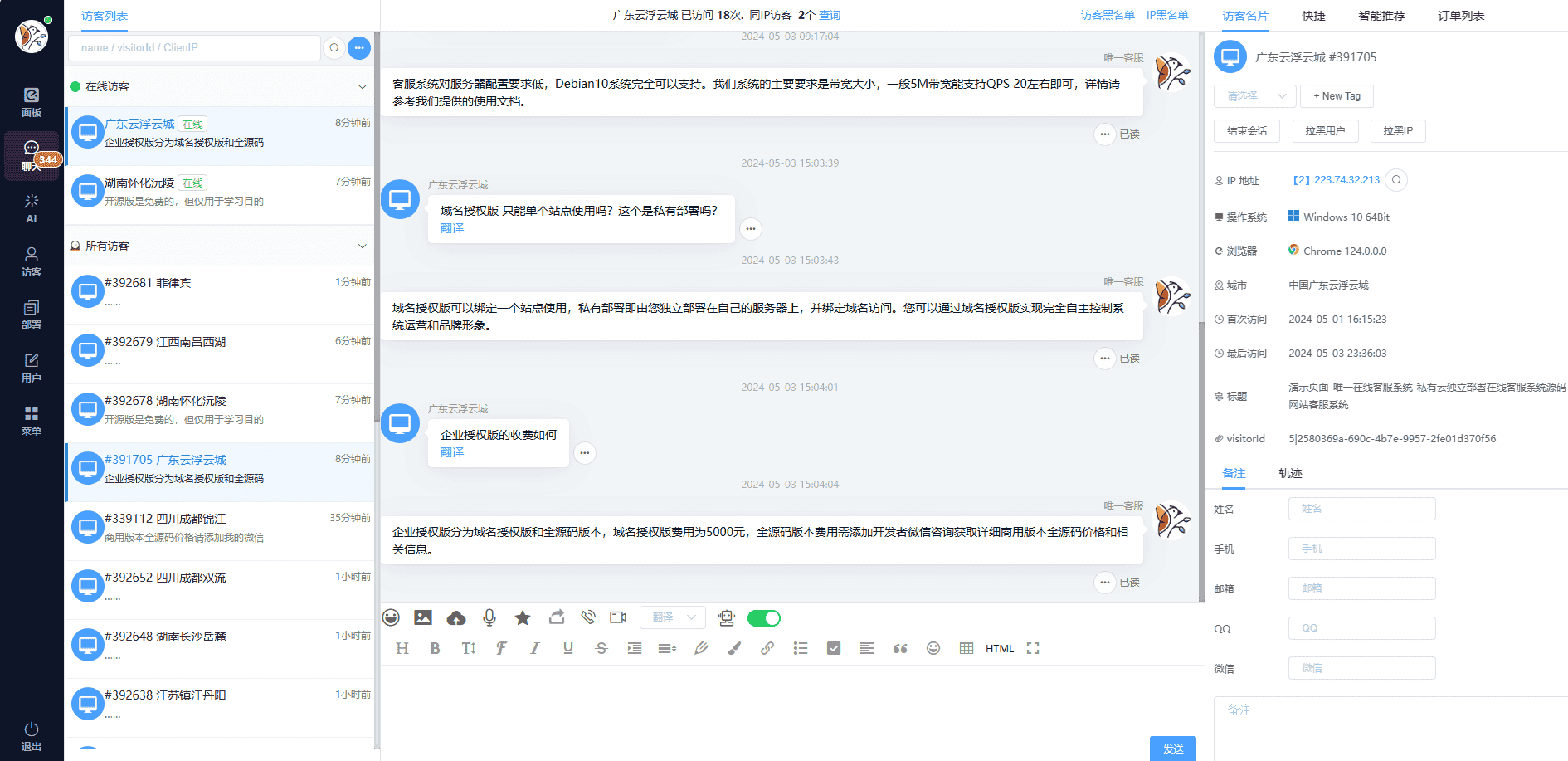此款客服系统可以对接ChatGPT,也可以对接国内大模型实现智能AI回复 访客界面是可以切换多国语言,实现多语言客服系统 客服后台功能完善,高性能大并发支持,并且占用资源很低,只要是服务器就能运行 即时通讯实时消息接受,可以随时获取到访客的咨询信息,不放过一个意向客户