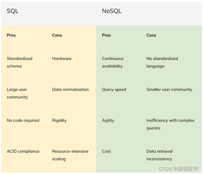 (1)标准化模式。虽然 SQL 数据库的标准化模式使它们变得僵硬且难以修改,但它确实具有一些优势。添加到数据库的所有数据都必须符合众所周知的由行和列组成的链接表模式。有些人可能会发现这种局限性,但当数据一致性、完整性、安全性和合规性非常重要时,它会很有帮助。