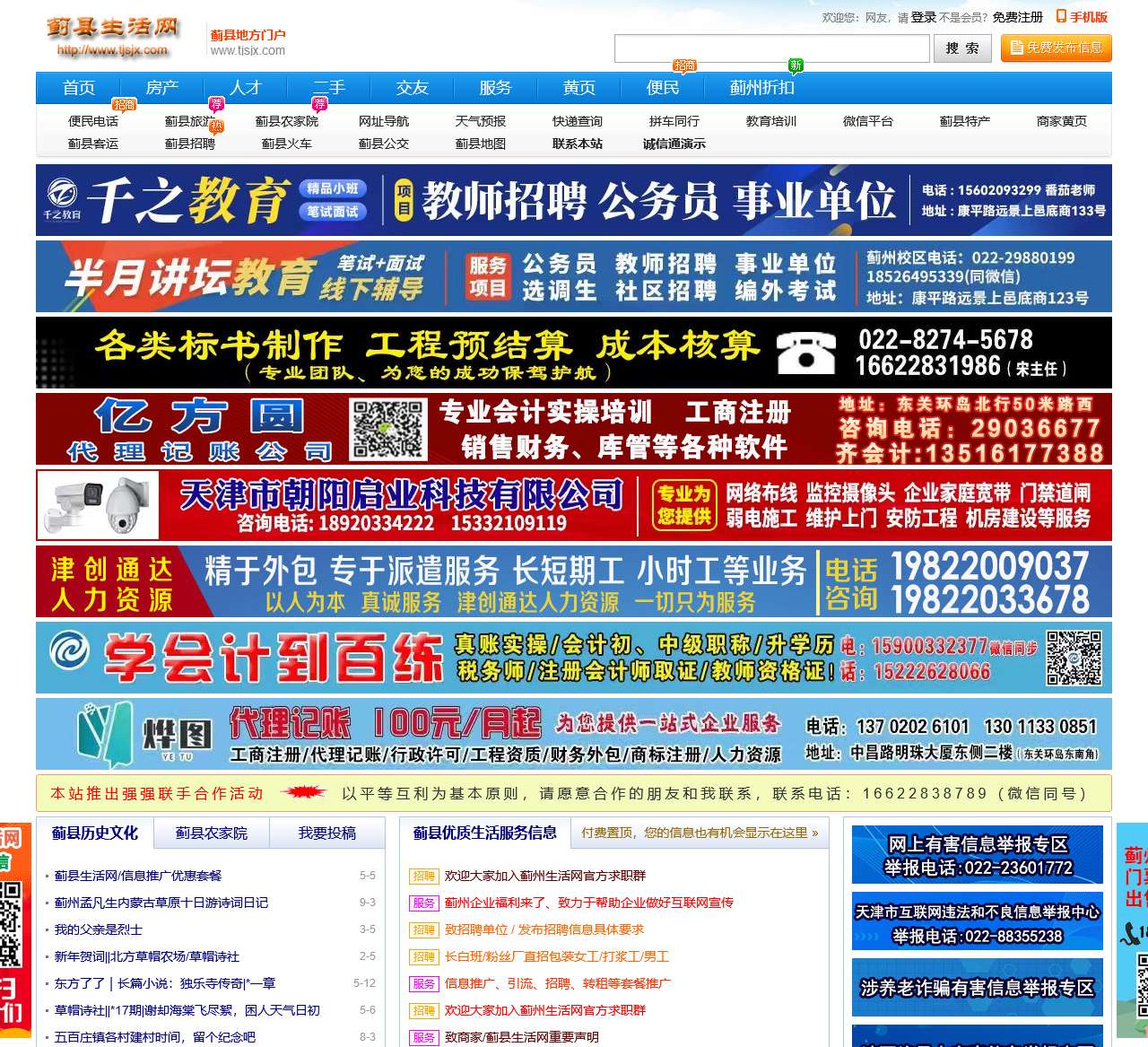 蓟县生活网-蓟州生活网,是蓟县地区的综合信息门户网站,致力于为用户提供全面、便捷、实用的生活服务信息。从房产、人才招聘到旅游、农家院,以及各类便民服务,我们涵盖了丰富多彩的生活领域。以下是网站首页内容的整理: