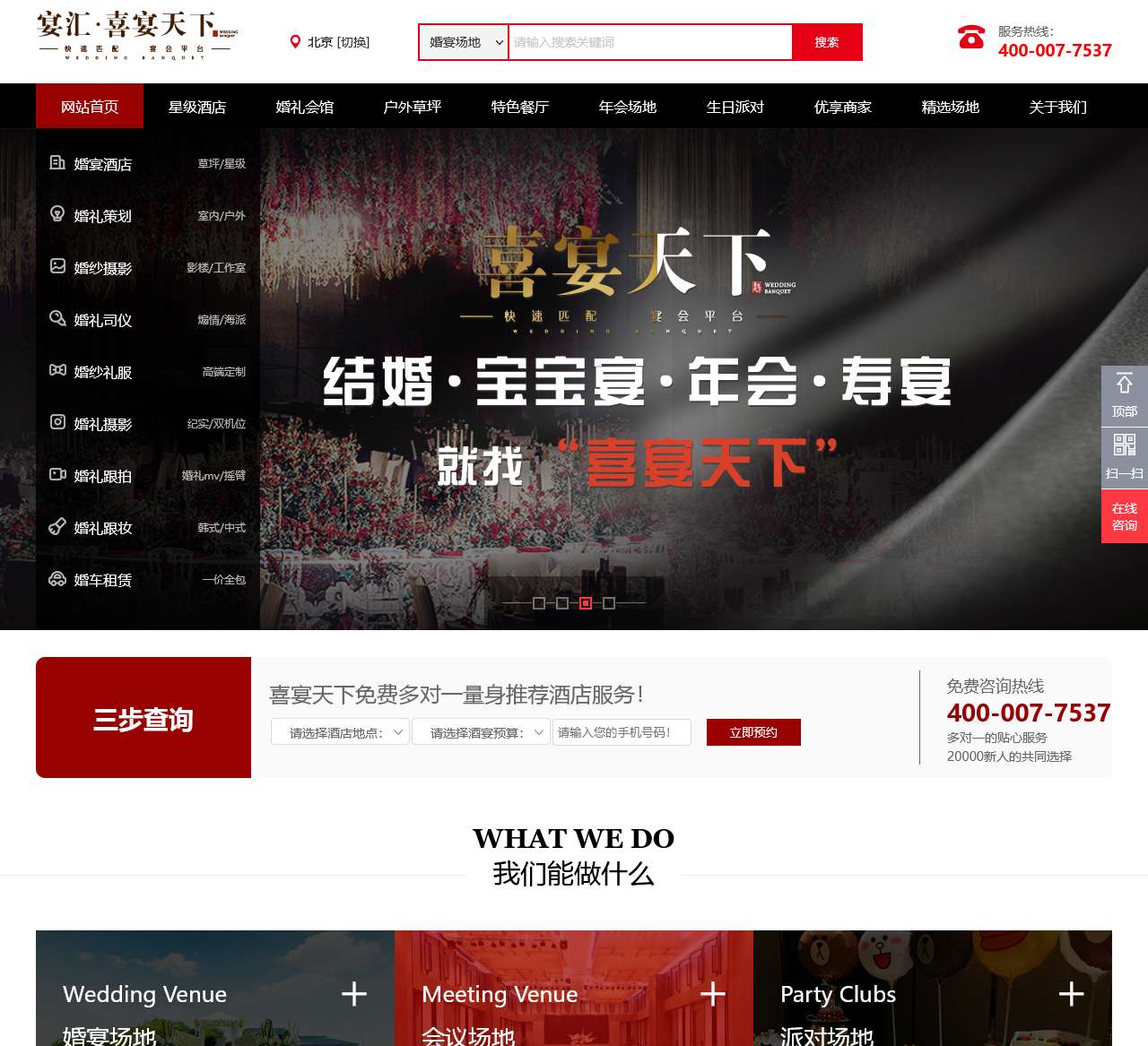 北京喜宴天下科技有限公司-宴会预定中心,线上是以婚宴及宴会预定为核心基础内容,线下以酒店运营管理为中心,同时服务于用户和酒店的平台,为客户量身定制婚宴及各种宴会的优质选择服务,通过整合本地结婚各行业最具口碑优质商户,从宴会预定到宴会统筹服务,让您省钱,省时,省心有保障!