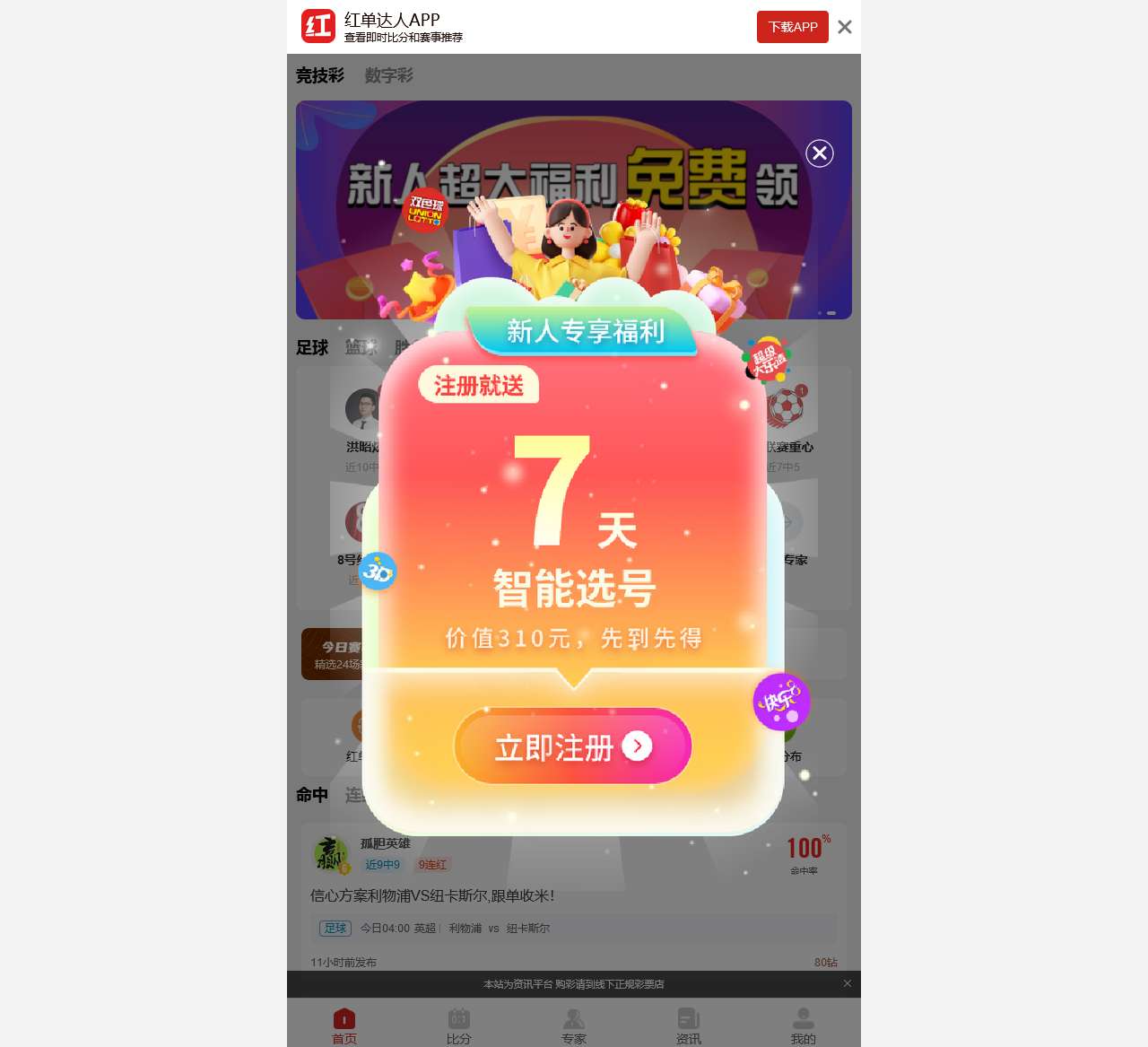 欢迎来到红单达人,您的竞技彩数字彩利润增长的得力助手!我们汇聚了一群经验丰富的专家,为您提供精准的竞彩预测和冷门预警。不容错过的免费推荐,以及买量分布和红单模型等多项功能,让您在竞彩世界中游刃有余。