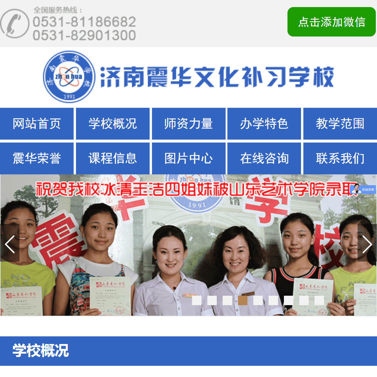 欢迎来到济南市震华文化补习学校的官方网站!我们是一所专注于高中生高考复读的学府,以优质的教学团队、丰富的办学经验和卓越的教学质量而闻名。在这里,我们为学子提供全面的高三复读服务,助力他们在高考中取得优异的成绩。以下是我们网站首页各个导航标签的介绍: