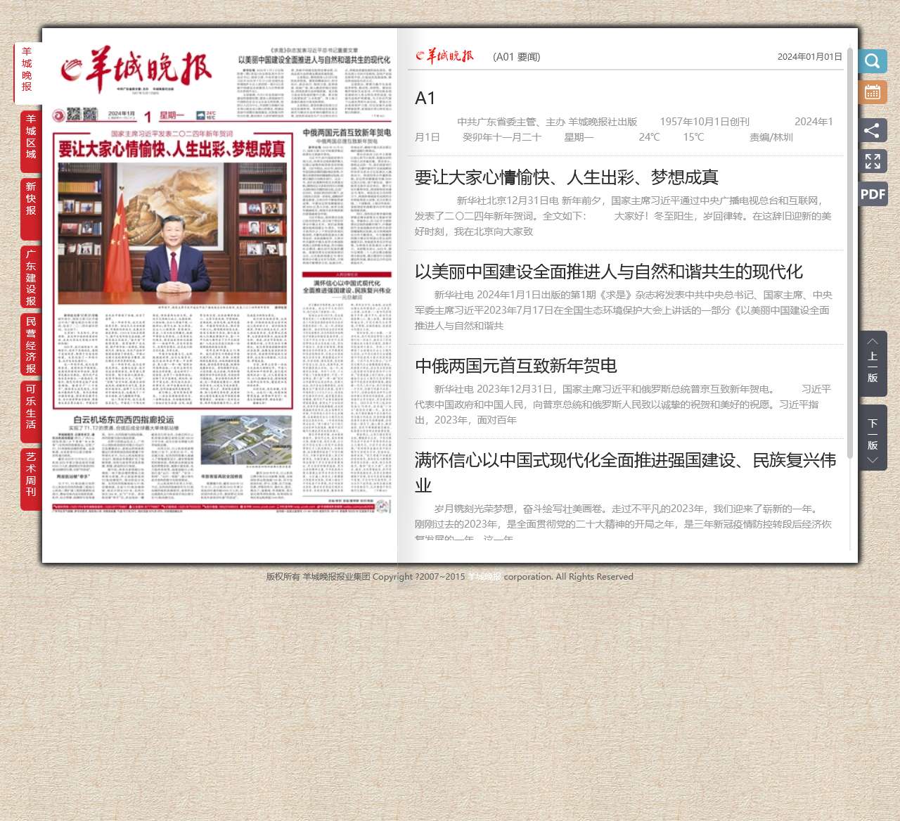 markdown# 网站首页 - 要闻板块 ## 2024年01月01日 ### A1 要让大家心情愉快、人生出彩、梦想成真 以秀丽中国建设全面推进人与自然和谐共生的现代化 中俄两国元首互致新年贺电 - 满怀信心以中国式现代化全面推进强国建设、民族复兴伟业 - 白云机场东四西四指廊投运 ### 羊城晚报 (A01) 要闻 (A02) 要闻 (A03) 时事 (A04) 体育 (A05) 文娱 (A06) 教育 (A07) 健康 - 七杯茶·我的2023 - 晚晚好彩·体彩 - 广告 ### 相关区域报道 - 羊城区域 - 新快报 - 广东建设报 - 民营经济报 - 可乐生活 - 艺术周刊 - 羊城晚报