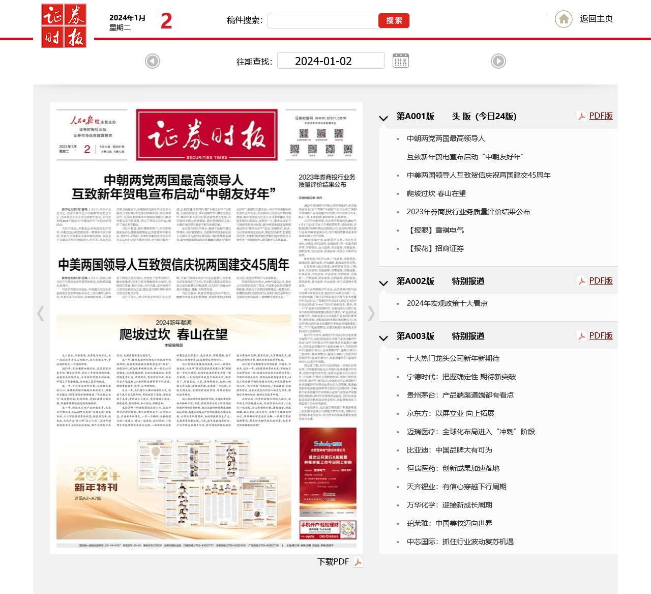 markdown# 网站首页SEO优化介绍 ## 中朝友善年启动,中美建交45周年庆祝 - [返回主页](#) | [下载PDF](#) | [第A001版头 版(今日24版)](#) - 中朝两党两国最高领导人互致新年贺电,宣布启动“中朝友善年”。 - 中美两国领导人互致贺信,庆祝两国建交45周年。 ## 行业新闻特别报道 - [第A002版特别报道](#):2024年宏观政策十大看点 - [第A003版特别报道](#):十大热门龙头公司新年新期待 - 宁德时代:把握确定性,期待新突破 - 贵州茅台:产品端渠道端都有看点 - 京东方:以屏立业,向上拓展 - 迈瑞医疗:全球化布局进入“冲刺”阶段 - 比亚迪:中国品牌大有可为 - 恒瑞医药:创新成果加速落地 - 天齐锂业:有信心穿越下行周期 - 万华化学:迎接新成长周期 - 珀莱雅:中国美妆迈向世界 - 中芯国际:抓住行业波动复苏机遇 - [第A004版特别报道](#):行业首席分析师前瞻2024赛道风云 - 金属和金属新材料行业:把握五条投资主线 - 汽车行业:从电动到智能,迎接创新大时代 - 新能源行业:各细分板块将迎拐点性机会 - 医药行业:创新+国际化,打开行业成长空间 - 银行行业:看好板块绝对收益 - 电子行业:国产科技自立自强 - 计算机行业:优选成长落地明确的公司 - 军工机械行业:布局困境反转,优选成长加速 - 房地产行业:城中村与保障房是投资重点 - 通信行业:聚焦三大投资主线 - [第A005版特别报道](#):机构首席经济学家展望2024大趋势 - 中国资本市场发展环境正在改善 - “三管齐下”改善社会预期,股市或迎来修复行情 - 2024年中国经济有望增长5%左右 - “三驾马车”推动需求企稳回升,基本面回暖支撑A股向上 - 2024年中国出口增速将好转,国企将成经济转型重大推动力量 - 经济在“东风化雨”中延续复苏 - [第A006版特别报道](#):基金经理分享2024投资锦囊 - 2024年投资聚焦科技、安全和内循环 - 春天只会延迟,不会缺席 - 市场可能继续分化,精选个股是关键 - 科技周期正式开启,成长风格有望占优 - 树立辩证周期意识,敢于逆向布局 - [第A007版特别报道](#):2024年二十大潜力股任你挑 - [第A008版信息披露](#):浙江艾罗网络能源技术股份有限公司首次公开发行股票科创板上市公告书提示性公告 - [第A009版信息披露](#):广晟有色金属股份有限公司关于间接控股股东签署《无偿划转协议》暨实际控制人拟发生变更的提示性公告 - [第A010版信息披露](#):博时基金管理有限公司关于以通讯方式召开博时安诚3个月定期开放债券型证券投资基金基金份额持有人大会的第一次提示公告 - [第A011版信息披露](#):金融街控股股份有限公司第十届董事会第九次会议决议公告 - [第A012版信息披露](#):富国基金管理有限公司关于指定证券投资基金主流动性服务商的公告 ## 今日公告导读 - [第B001版信息披露](#):国寿安保基金管理有限公司关于以通讯方式召开国寿安保华丰混合型证券投资基金基金份额持有人大会的公告 - [第B002版信息披露](#):上海联合产权交易所交易信息