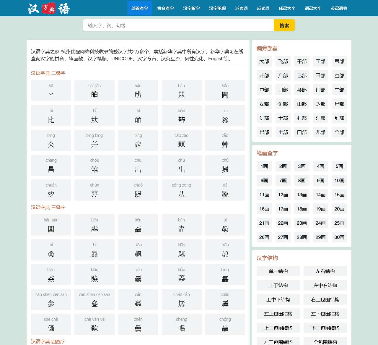 新华字典在线查字,支持按偏旁部首、拼音、笔画、汉字结构多种查字法。字典之家新华字典支持查询汉字的拼音、注音、部首、笔画、笔顺、结构、Unicode编号等内容。
