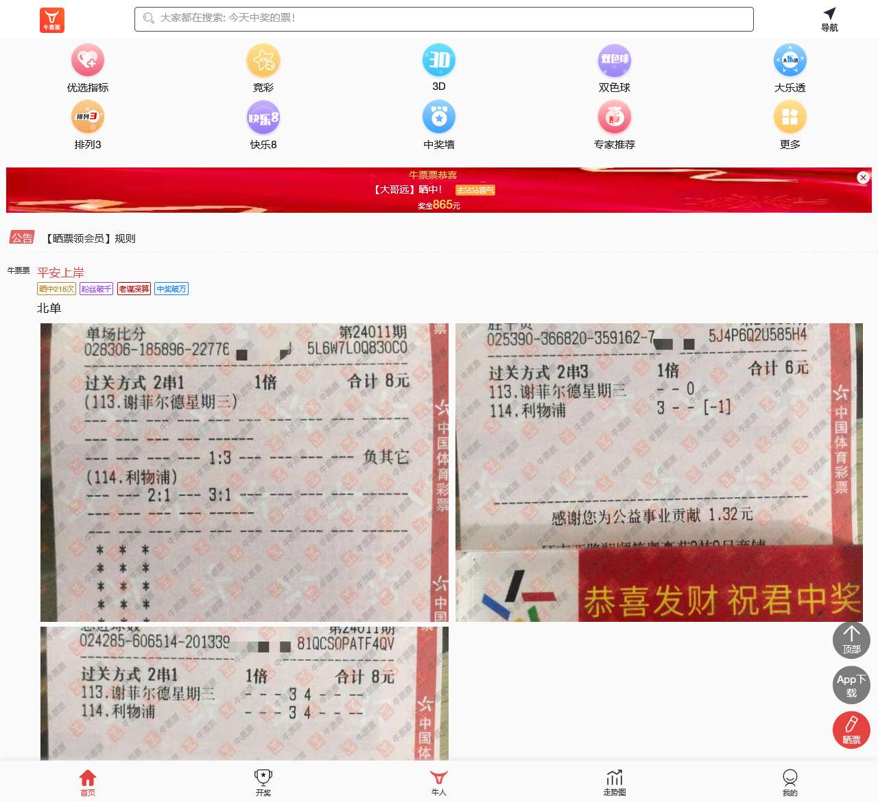 牛票票用实票说话,晒竞彩足球,晒3d实票,晒双色球实票,晒大乐透实票,为彩民提供晒票,看实票,开奖结果查询等服务。