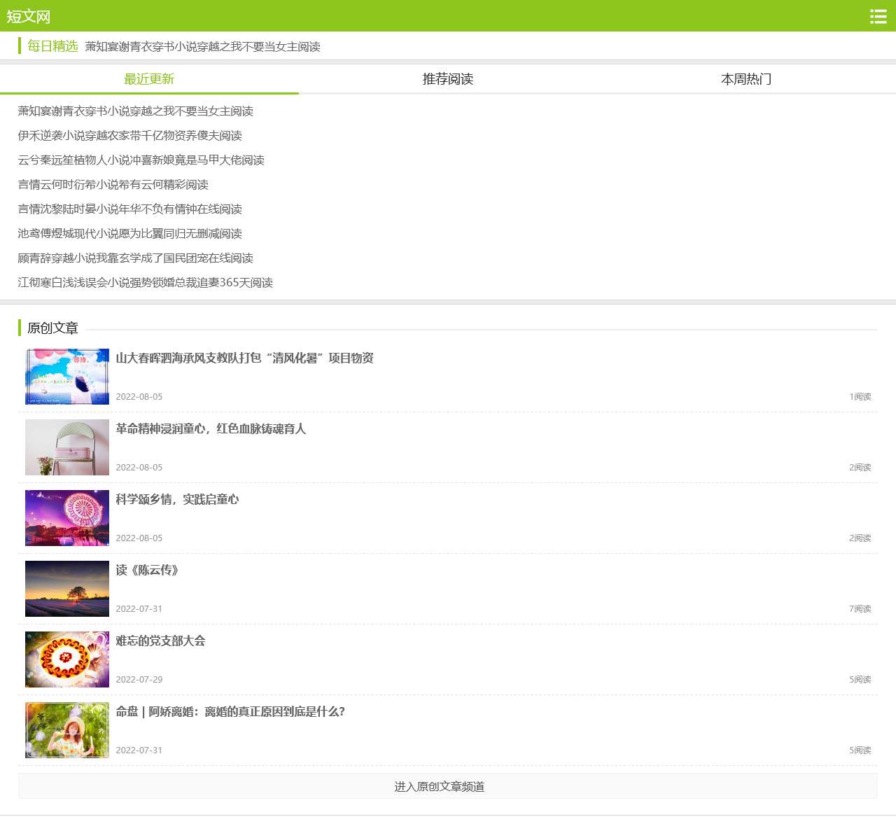 短文网是一个网络文学短篇文学网,提供海量原创精品优美散文、现代诗歌、感人爱情文章、心情日志、睡前故事等2022最新短篇文章大全。