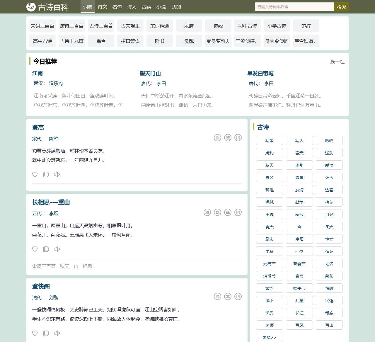 《古诗百科》网站是一个汇集古诗词大全、唐诗宋词三百首、诗词名句赏析等丰富内容的专业平台。以下是网站首页内容的整理: