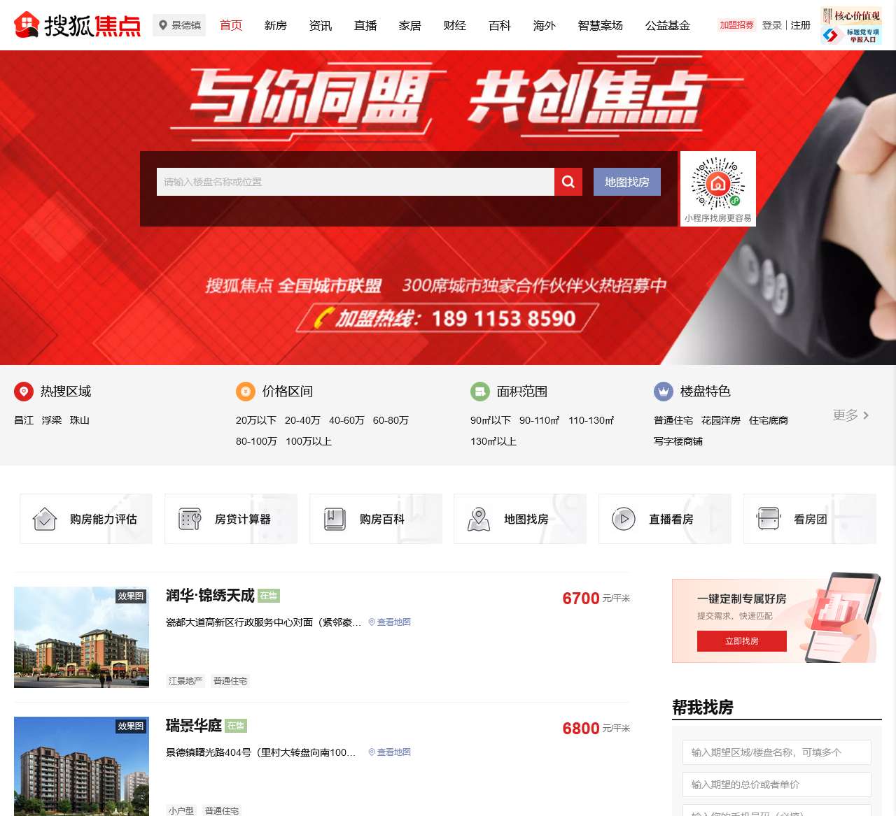 景德镇搜狐焦点网为购房者提供景德镇房产信息、家居装修资讯,景德镇房产楼盘详情、买房流程、业主论坛、家居装修等全面内容信息,景德镇搜狐焦点网互联网的购房平台。
