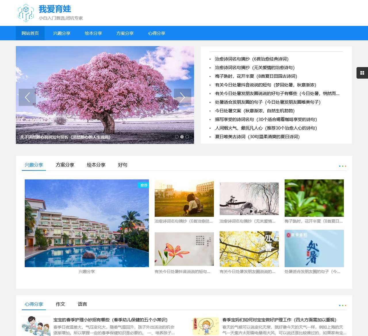 我爱育娃网站首页是您育儿之旅的小白入门首选,专注于闭坑经验的分享。我们致力于为您提供丰富多彩的内容,包括兴趣分享、绘本分享、方案分享以及心得分享。通过我们的网站,您可以获取到关于儿童成长的宝贵经验、心得和实用方法。