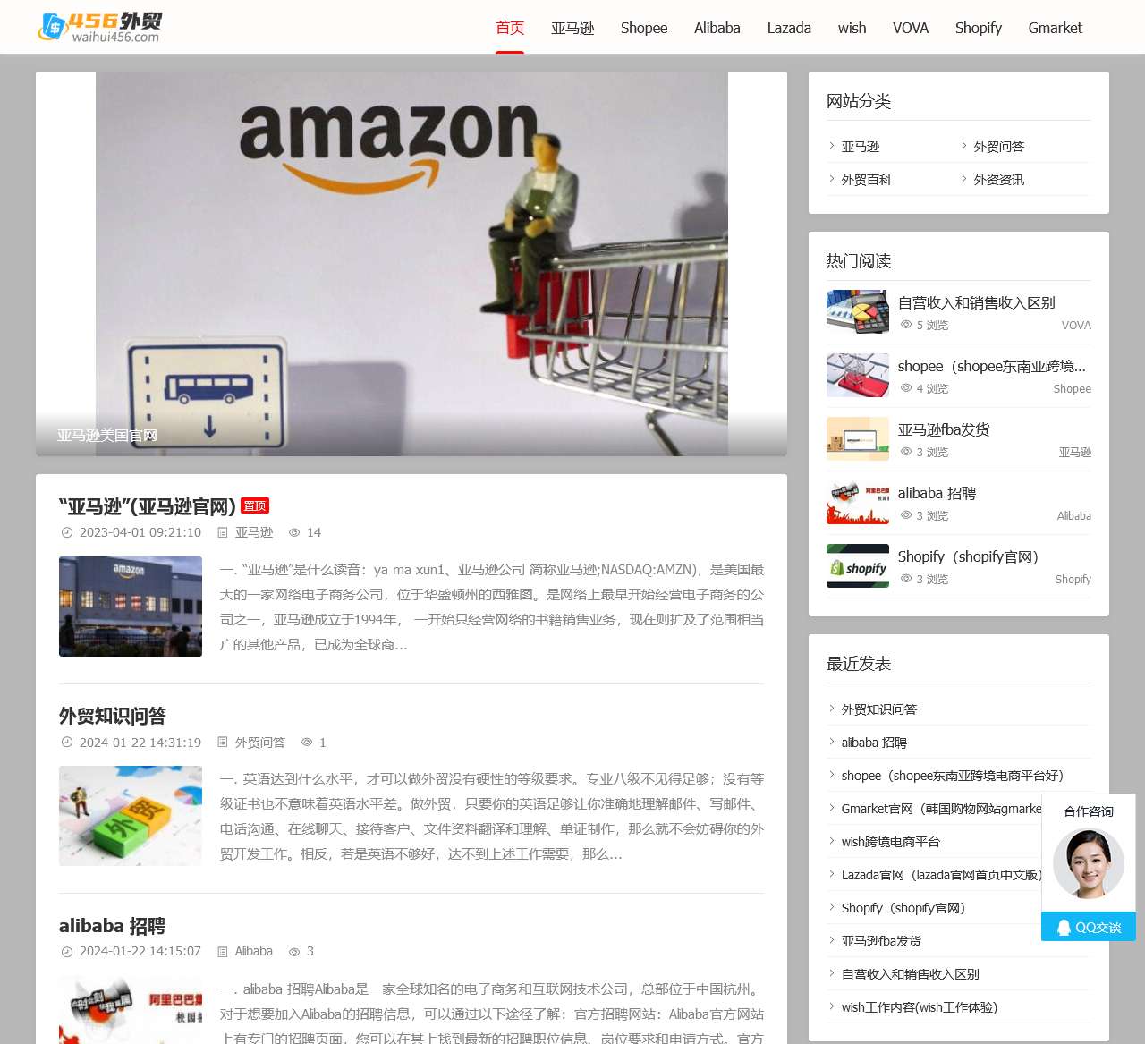 欢迎访问456外贸,您的跨境电商互联网学习平台。我们提供丰富的外贸知识问答、外贸百科和外资资讯,助您在亚马逊、Shopee、Alibaba等平台腾飞。以下是我们首页的关键链接: