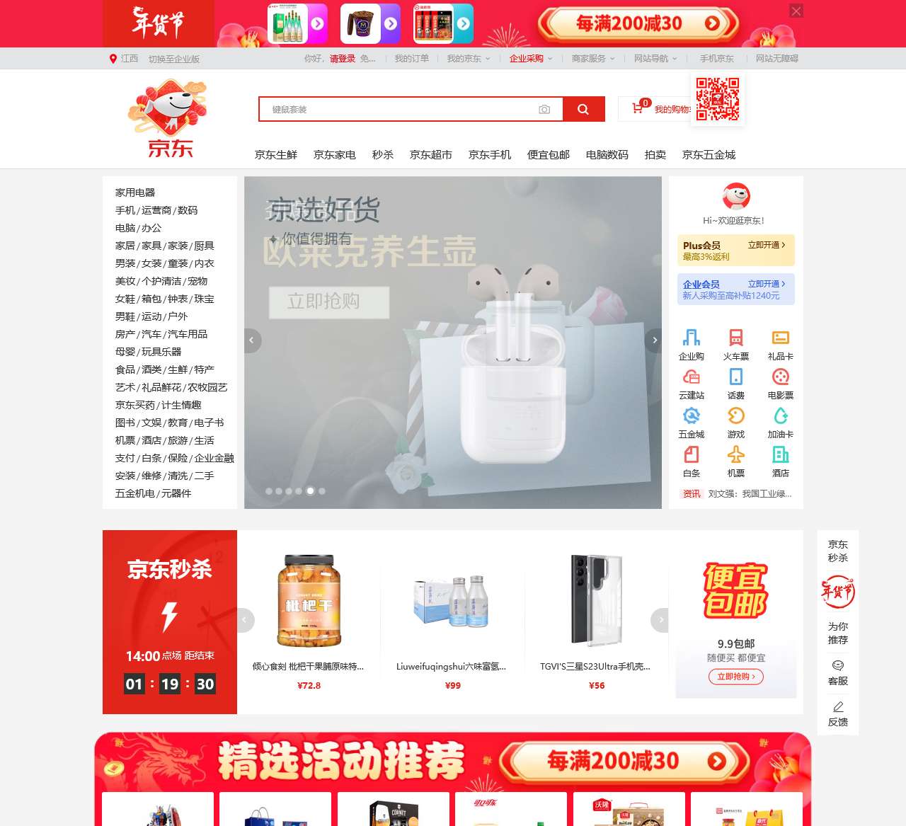 - 京东首页突出展示热门商品,包括生鲜、家电、秒杀等各类商品。