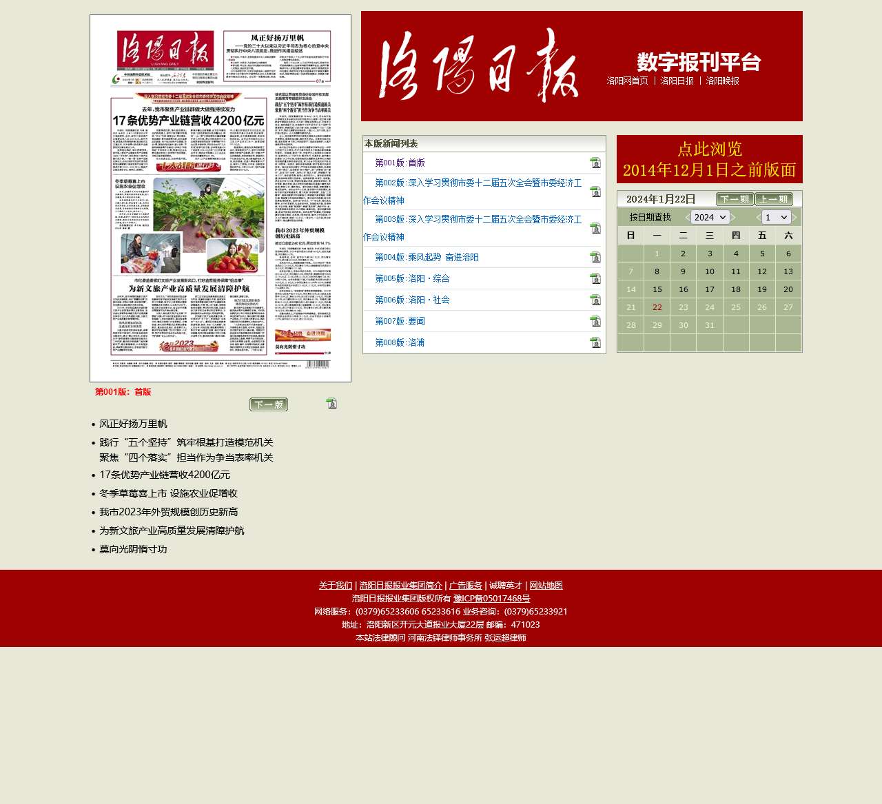 markdown# 洛阳网-打造模范机关,引领时代潮流 ## 网站首页简介 欢迎来到洛阳网,我们是一家致力于传播正能量、服务社会的新闻媒体。通过深入学习市委十二届五次全会暨市委经济工作会议精神,我们坚持践行“五个坚持”原则,以此筑牢根基,打造模范机关。 ## 聚焦四个落实,争当表率机关 在我们的努力下,形成了17条优势产业链,实现了令人瞩目的营收达4200亿元。冬季草莓的喜上市,设施农业促进增收,为新文旅产业的高质量发展清障护航。洛阳在2023年的外贸规模创下历史新高,为城市的繁荣做出了巨大的贡献。 ## 优势亮点 - 17条优势产业链,创造4200亿元营收 - 冬季草莓上市,推动设施农业增收 - 外贸规模创历史新高,为城市经济注入活力 ## 新闻版块概览 - **第001版:** 首版,引领时代潮流 - **第002版:** 深入学习贯彻市委十二届五次全会暨市委经济工作会议精神 - **第003版:** 深入学习贯彻市委十二届五次全会暨市委经济工作会议精神 - **第004版:** 乘风起势,奋进洛阳 - **第005版:** 洛阳·综合 - **第006版:** 洛阳·社会 - **第007版:** 要闻 - **第008版:** 洛浦 点击[此处](链接至2014年12月1日之前版面)浏览2014年12月1日之前的版面。 洛阳网,与时俱进,传递正能量,引领洛阳发展新篇章!