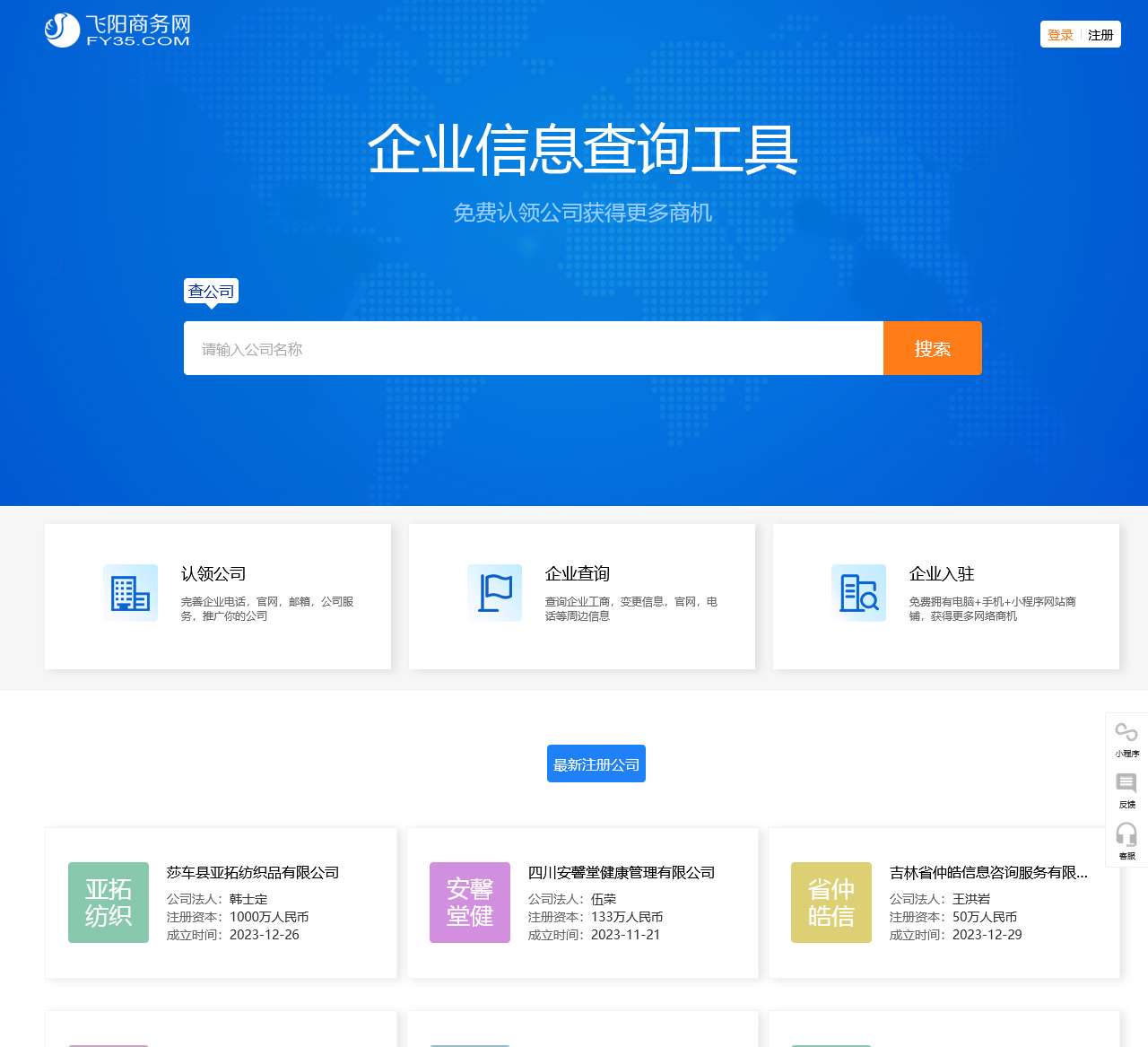 欢迎访问飞阳商务网,您的专业企业信息查询工具。在这里,您可以轻松实现公司信息的全方位查询和管理。无论您是想认领公司、完善企业信息,还是进行企业查询或入驻,飞阳商务网都为您提供便捷的服务。以下是我们网站的主要功能和特点: