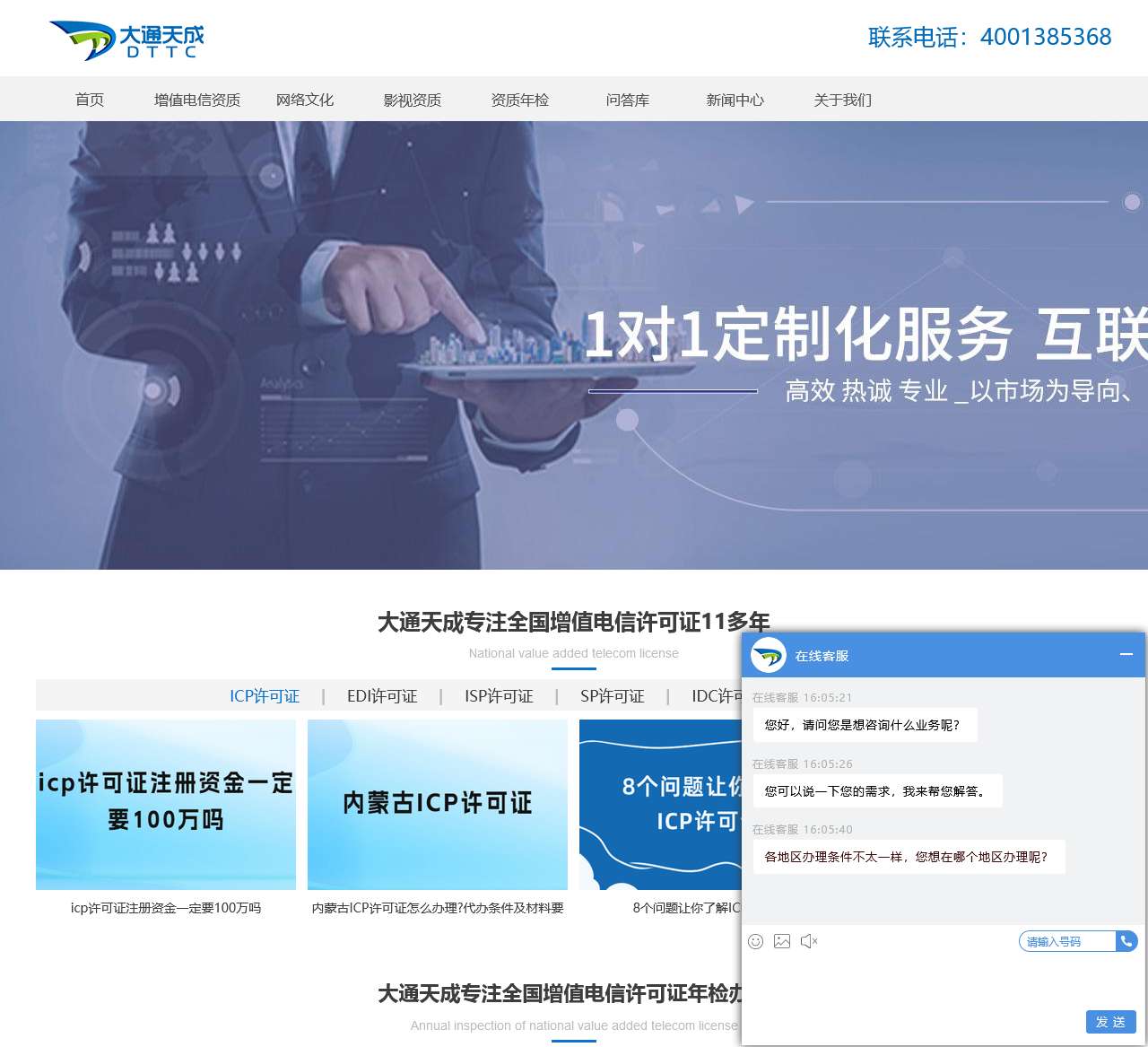 大通天成优质的增值电信业务经营许可证代理机构,包含ICP,SP,EDI,ISP,IDC,CDN,呼叫中心许可证等许可证的办理申请、变更、年检、续期、备案查询及费用等增值电信许可证服务业务,为全国中小企业提供增值电信许可证代办服务。