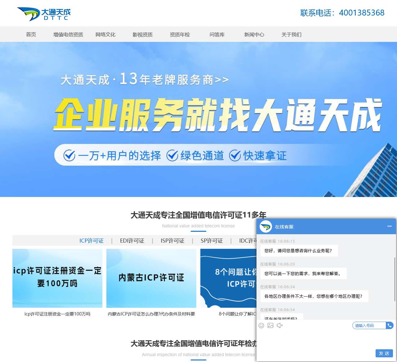 大通天成优质的增值电信业务经营许可证代理机构,包含ICP,SP,EDI,ISP,IDC,CDN,呼叫中心许可证等许可证的办理申请、变更、年检、续期、备案查询及费用等增值电信许可证服务业务,为全国中小企业提供增值电信许可证代办服务。
