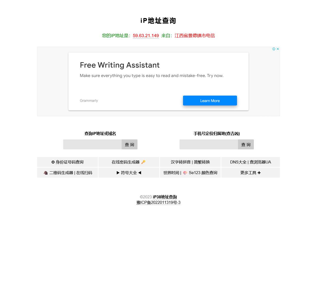 欢迎访问iP38查询网,您的专业iP地址查询工具。我们为您提供了多项实用工具,包括查吉凶、身份证号码查询、在线密码生成器、汉字转拼音、简繁转换、DNS大全、查浏览器UA、二维码生成器、在线扫码、符号大全、世界时间等功能。我们致力于为用户提供便捷、准确的查询服务。