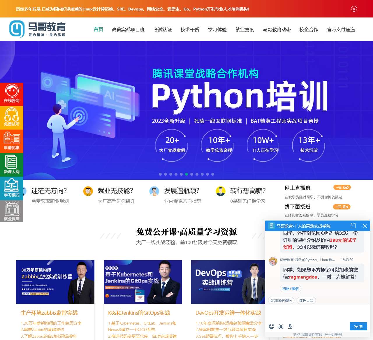 欢迎来到马哥教育官网,您的专业Linux运维、云计算、DevOps、网络安全培训之选。我们提供高薪实战项目班,涵盖Linux云计算SRE、Python全能开发、云原生微服务实战、go高并发实战、网络安全攻防渗透、DevOps项目实战等多个领域。同时,我们支持各类考试认证,包括阿里云认证、RHCE、CKA/CKS、CISP、Nginx等。