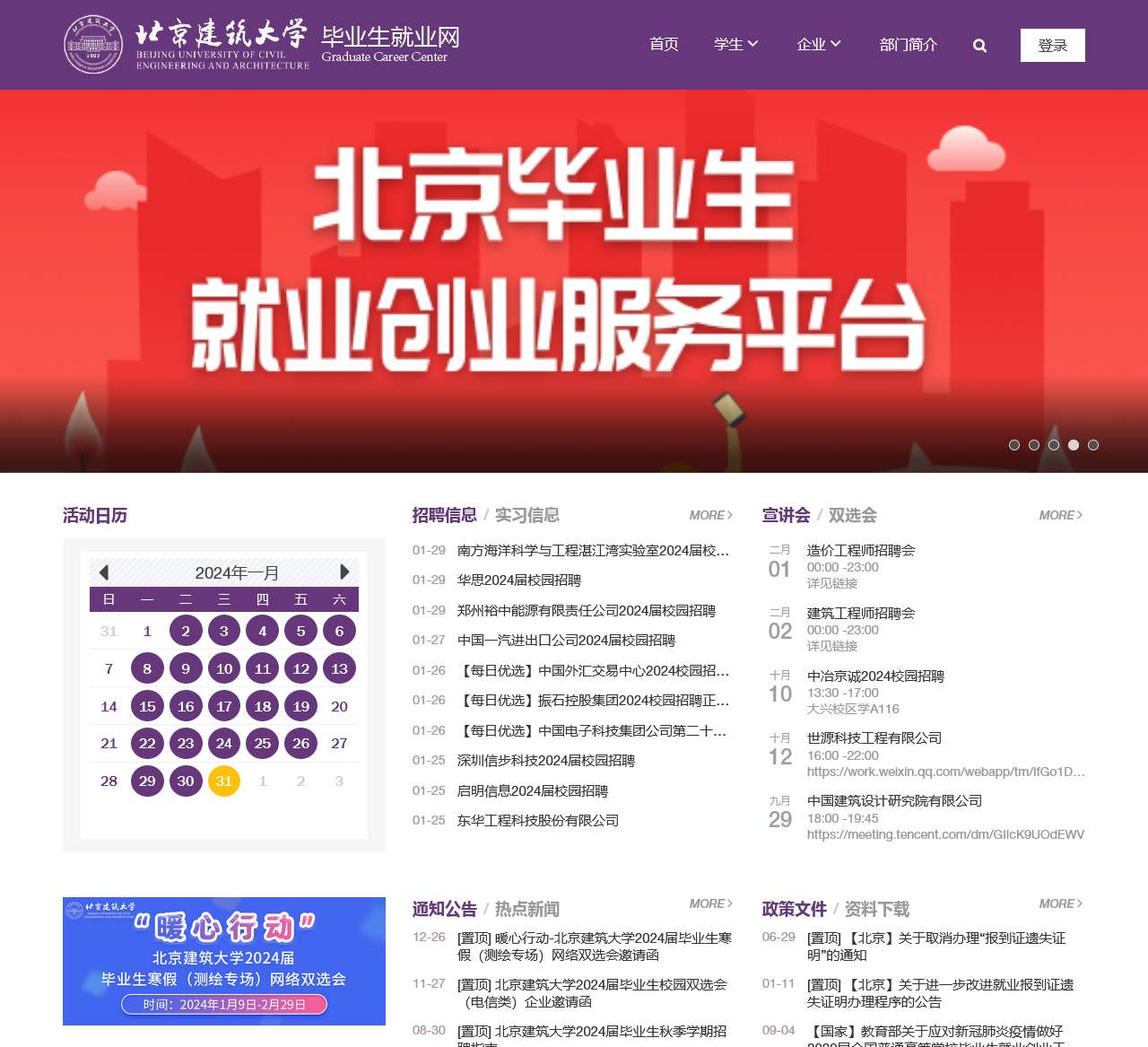 欢迎访问北京建筑大学毕业生就业网!本平台致力于为毕业生提供全方位、高效的就业服务,涵盖宣讲会、双选会、招聘信息、实习信息、手续办理、就业政策、职业测评、职涯调研、求职辅导等多个功能区,为学生和企业搭建了一个有效的沟通桥梁。