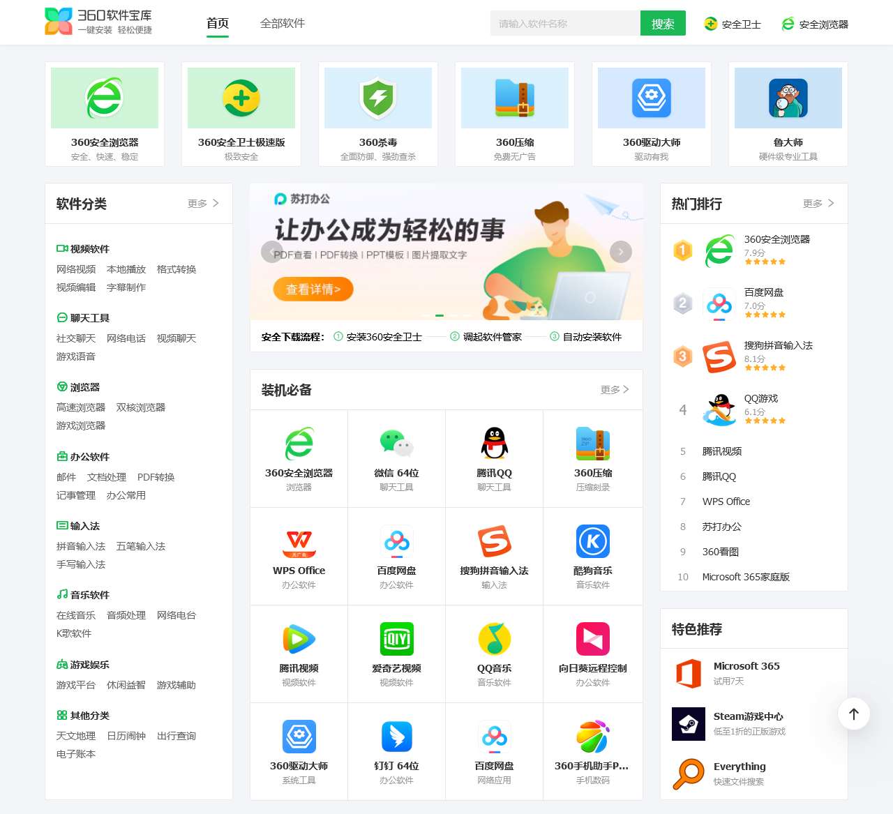 360软件宝库是一个集合了丰富软件资源的平台,致力于为用户提供安全、高速、免费的软件下载服务。我们的网站首页精心整理了各类软件,包括安全卫士、安全浏览器以及视频软件、聊天工具、浏览器、办公软件、输入法、音乐软件、游戏娱乐等多个分类,满足用户不同需求。