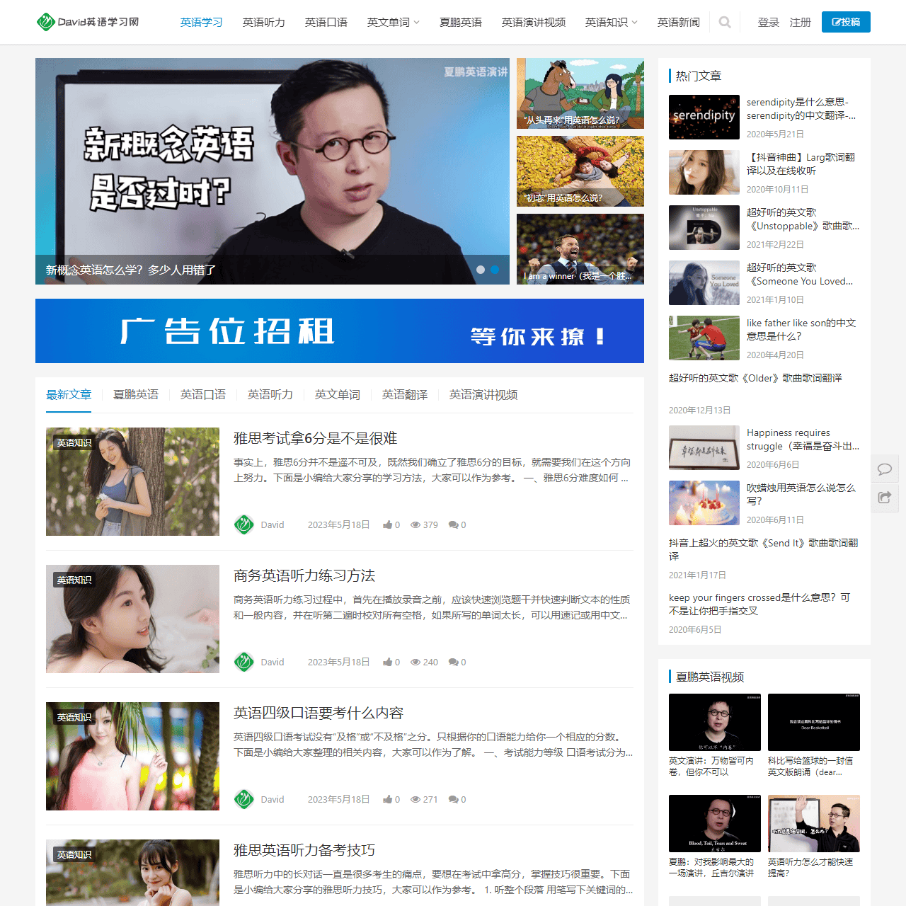 欢迎来到David英语学习网站,一个专注提升英语听说读写能力的在线学习平台。无论您是初学者还是有必定基础,我们都为您提供了丰富的学习资源,助您在英语学习的道路上取得更好的成绩。