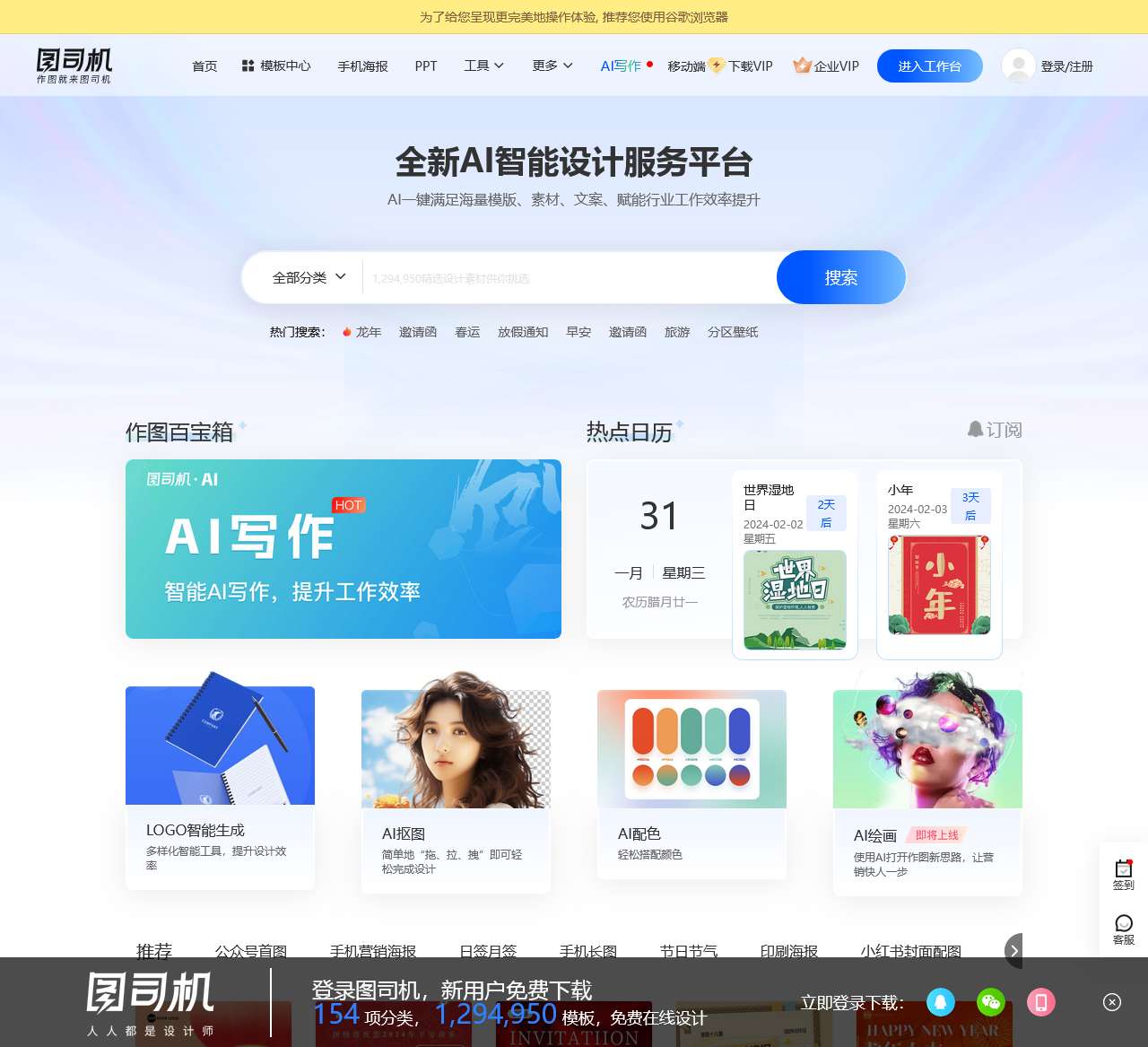 在【图司机】,新用户可以免费下载我们丰富的设计资源。拥有超过154个分类和1,294,950个模板,满足您各种创意需求,让设计变得更加轻松。