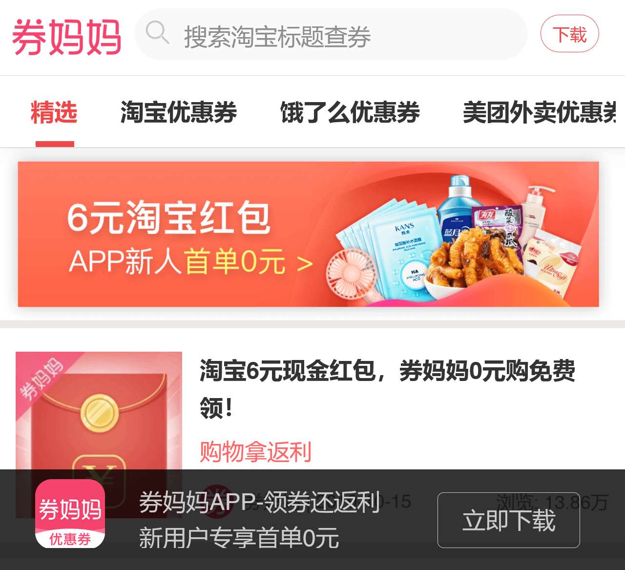 欢迎您来到券妈妈,这里为您精选了淘宝的6元现金红包,通过券妈妈您可以免费领取,无需任何消费,立即享受购物的返利。