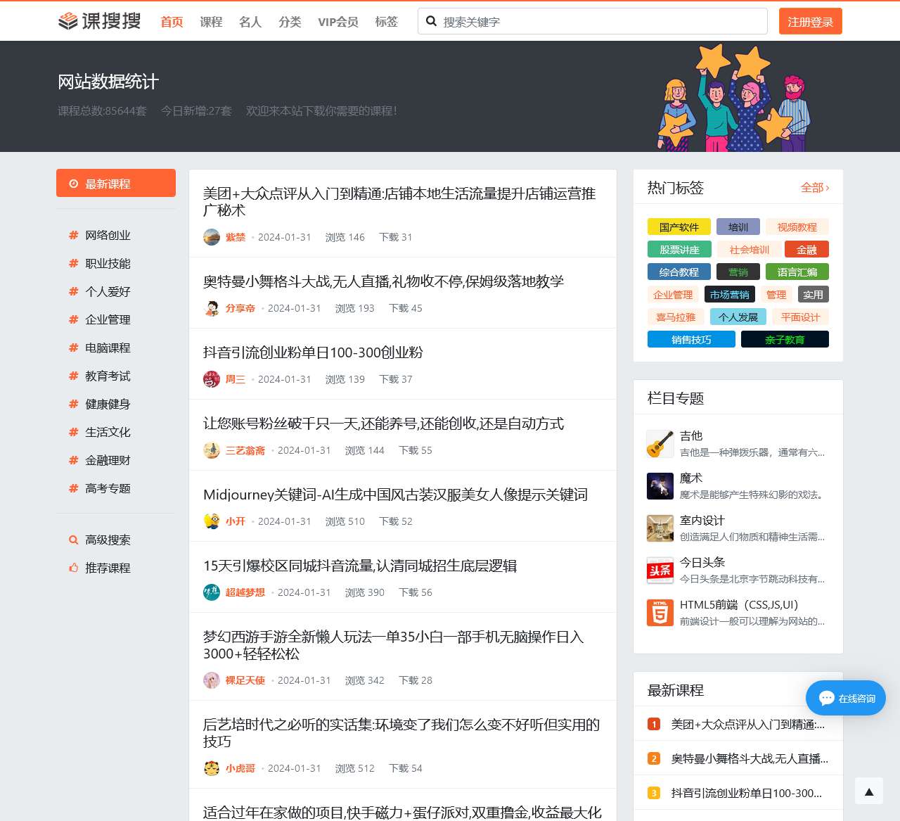 课搜搜是专业的课程分享和课程搜索网站,会员可以在网站上搜索到中小学网课、抖音课程、直播课程、电商课程、企业管理、编程、兼职赚钱等内容的视频讲座课程。