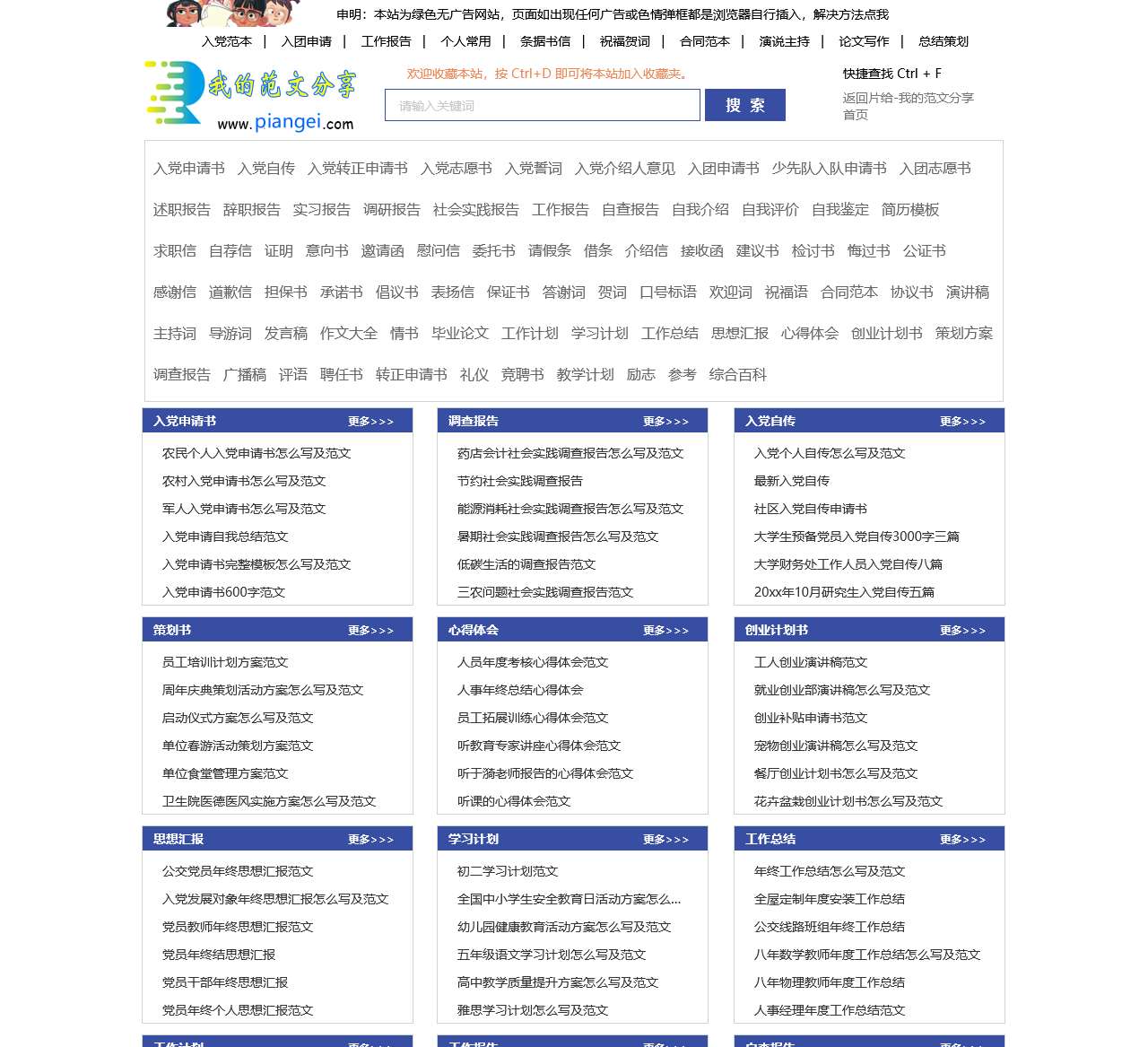 | 文书范本 | 入党范本、入团申请、工作报告、个人常用、条据书信、祝福贺词、合同范本、演说主持、论文写作、总结策划等。 |