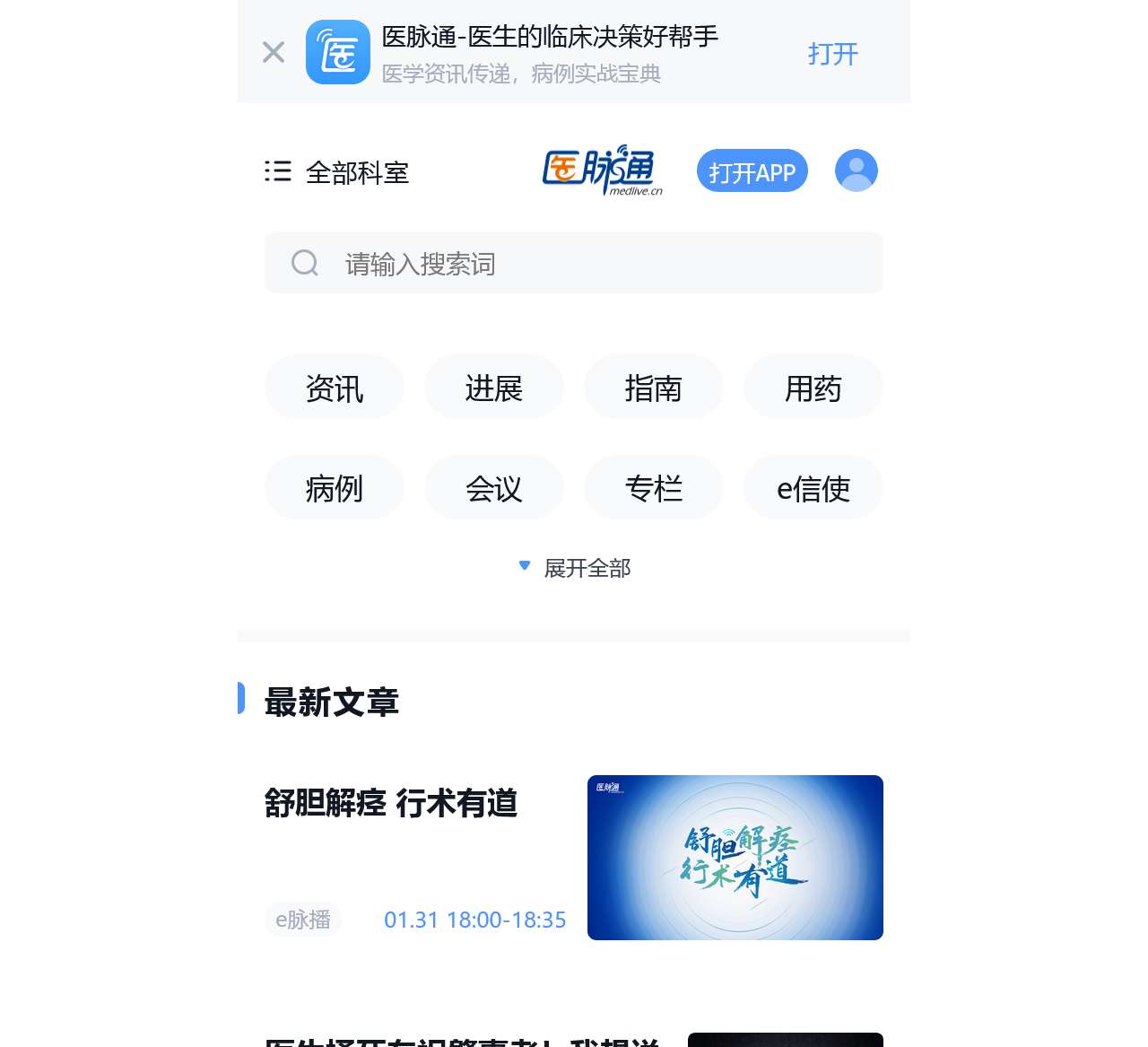 医脉通首页还提供了丰富的资讯内容,包括医学进展、指南、病例交流、会议等多个栏目。这些信息通过清晰的分类,使医生能够迅速定位到自己关心的领域。举例如下: