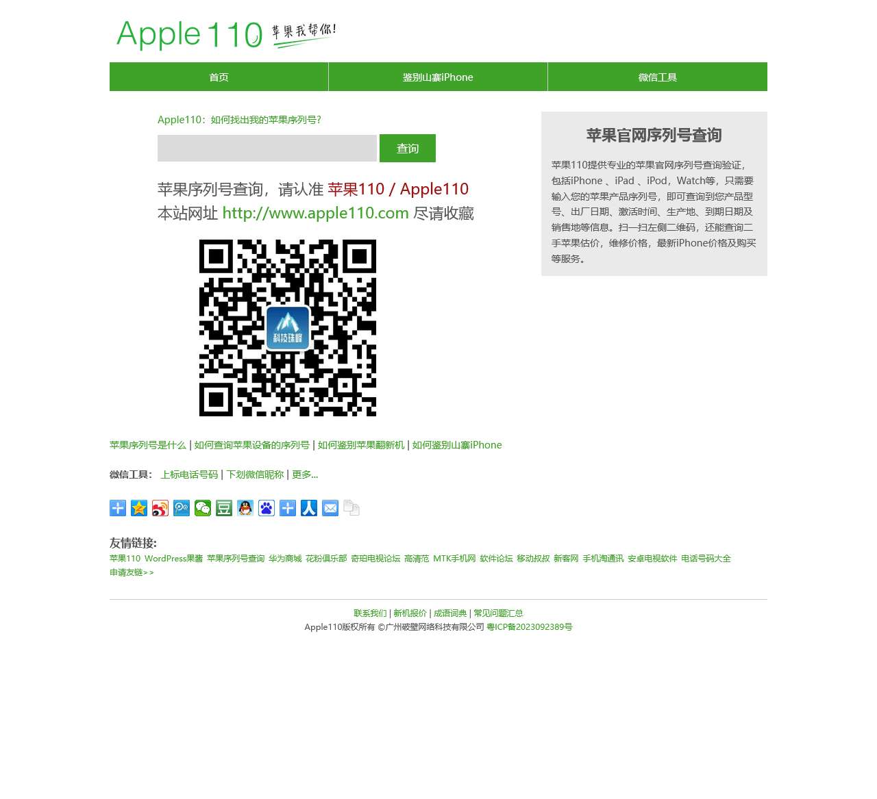 欢迎访问Apple110,您的苹果设备信息专家!我们是一家致力于为用户提供便捷、准确的苹果序列号查询服务的网站。通过我们的微信工具,您可以轻松鉴别山寨iPhone、查询苹果设备序列号,并获取关于设备的详细信息。以下是我们网站提供的主要功能: