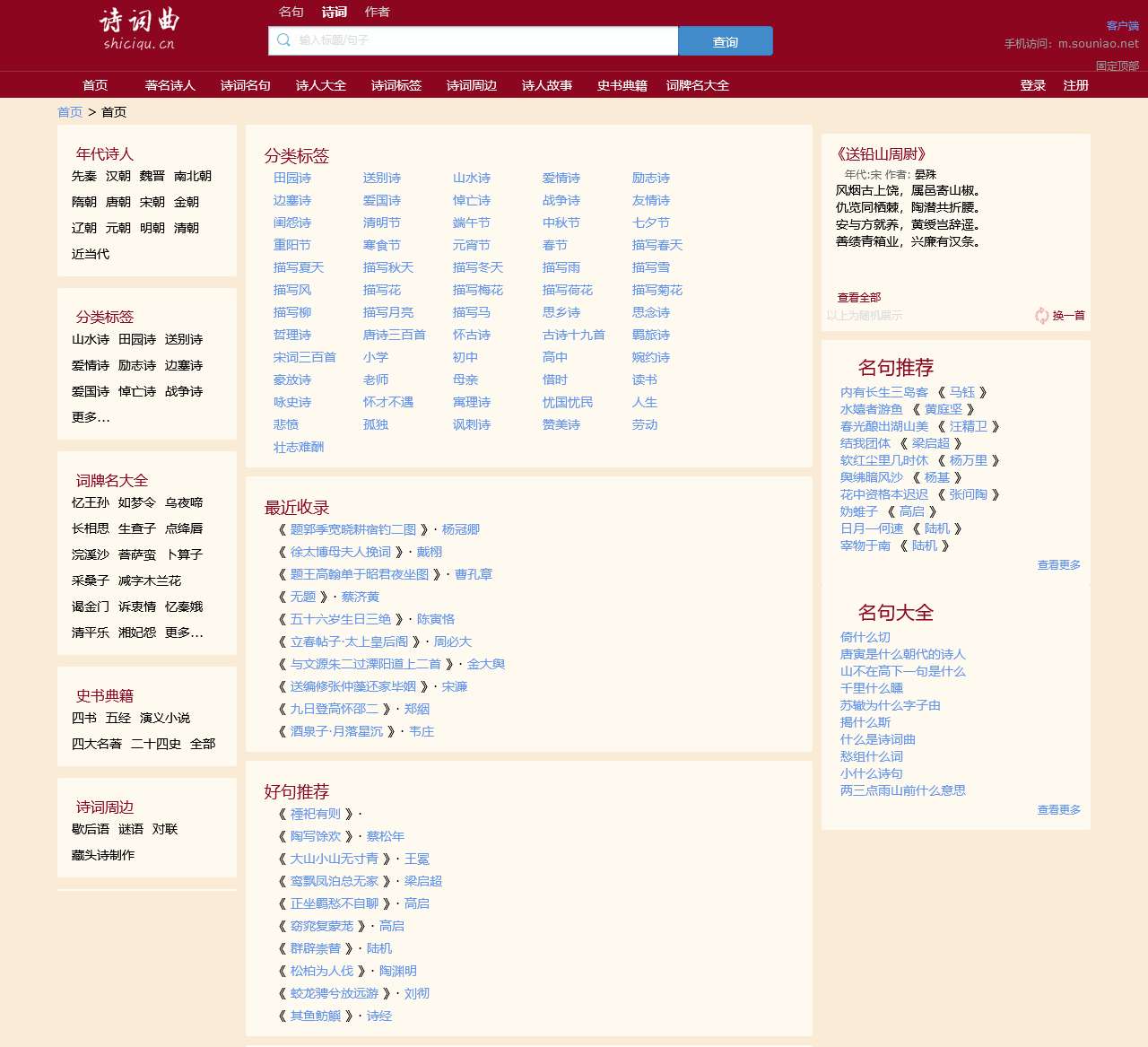 诗词曲(souniao.net)收录古诗词近30万首,诗句300万条,包括繁体版和简体版;提供高速精准的诗词、诗句、句首、句尾等查询服务。同时还提供史书典籍、谜语、歇后语、脑筋急转弯、对联等周边知识。