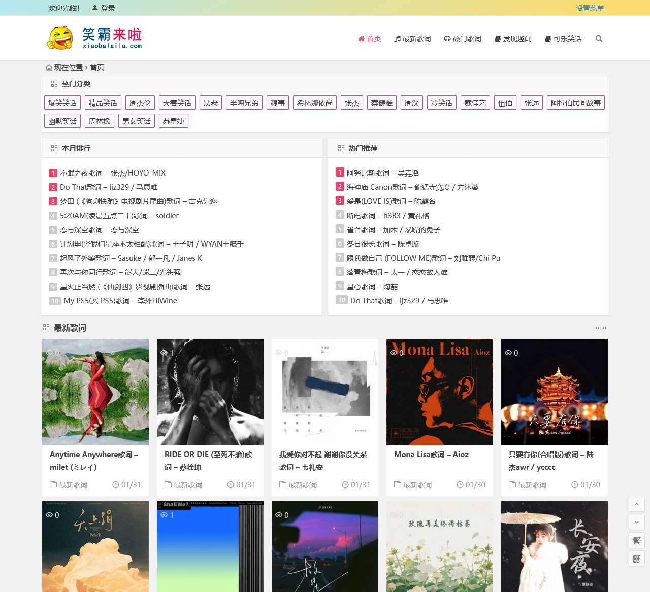 欢迎来到笑霸来啦,您的爆笑幽默、发现新鲜事的专属乐园!在这里,我们精心整理了最新歌词、热门歌词以及令人捧腹大笑的可乐笑话,为您带来欢笑与轻松。无论您是音乐爱好者还是喜爱幽默笑话,笑霸来啦都将是您的不二之选。