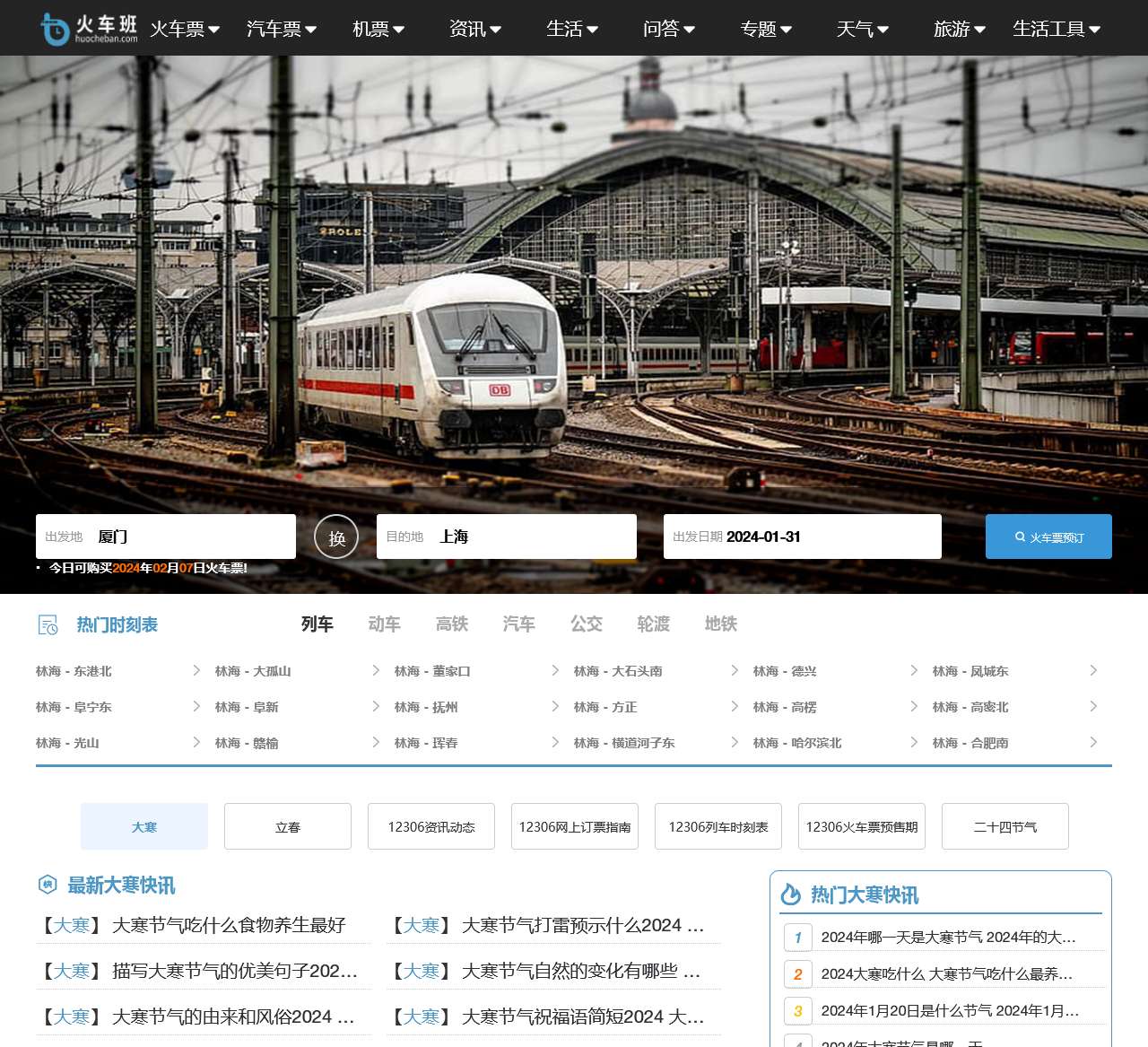 火车网为您提供各大城市火车时刻表查询、火车票价查询、火车票预订、火车票预订电话等信息,还有汽车时刻表查询、公交查询、天气预报查询等,为您的出行带来便利。