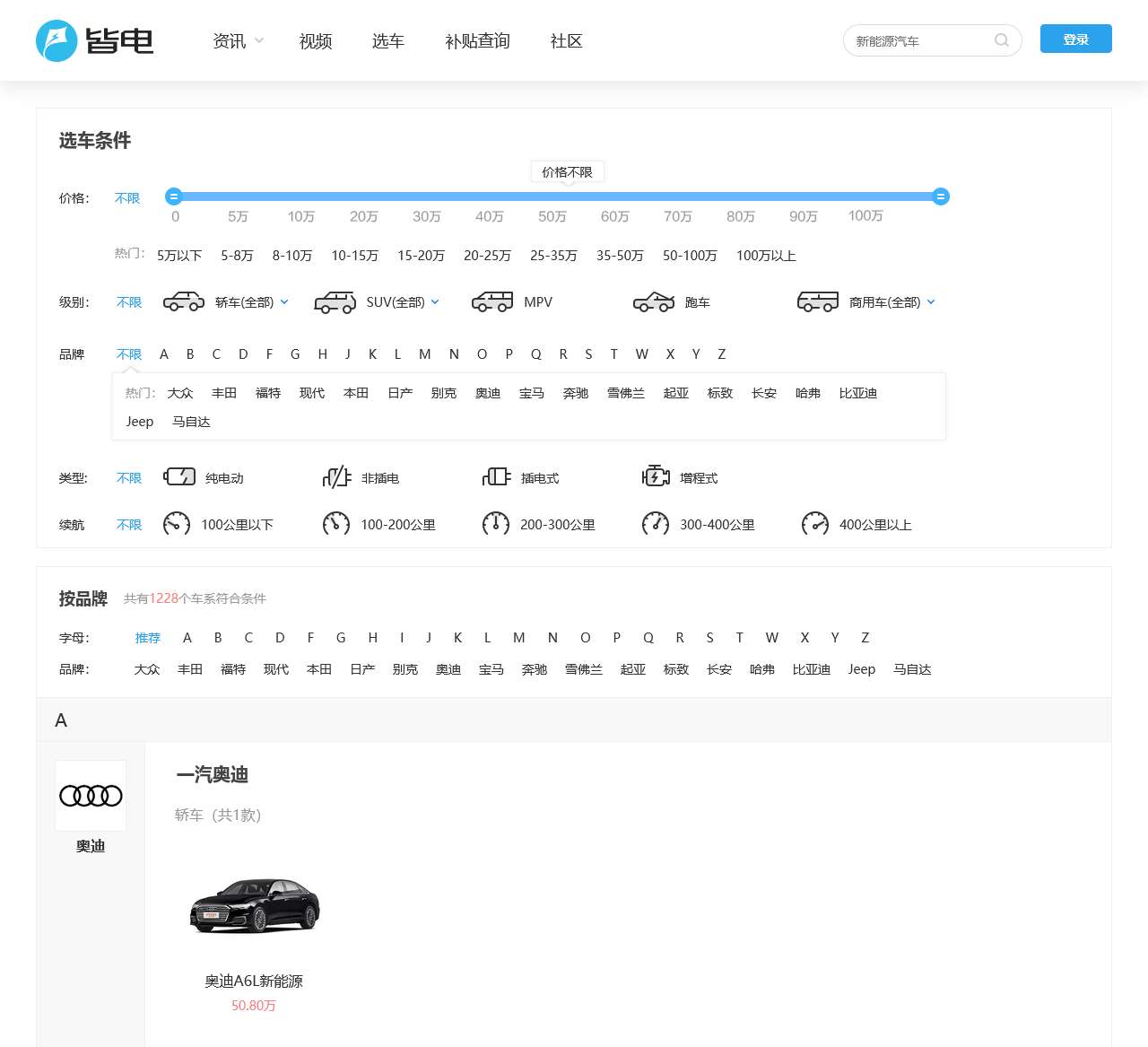 网站首页提供了丰富的电动汽车相关内容,包括资讯、视频、选车、补贴查询、社区等,覆盖了新能源汽车的价格范围、车型分类以及品牌选择等方面。以下是对网站首页内容的整理: