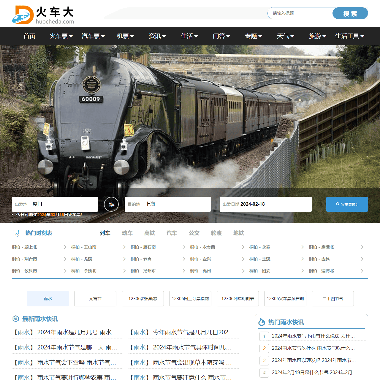 火车大为您提供各大城市火车时刻表查询、火车票价查询、火车票预订、火车票预订电话等信息,还有汽车时刻表查询、公交查询、天气预报查询等,为您的出行带来便利。