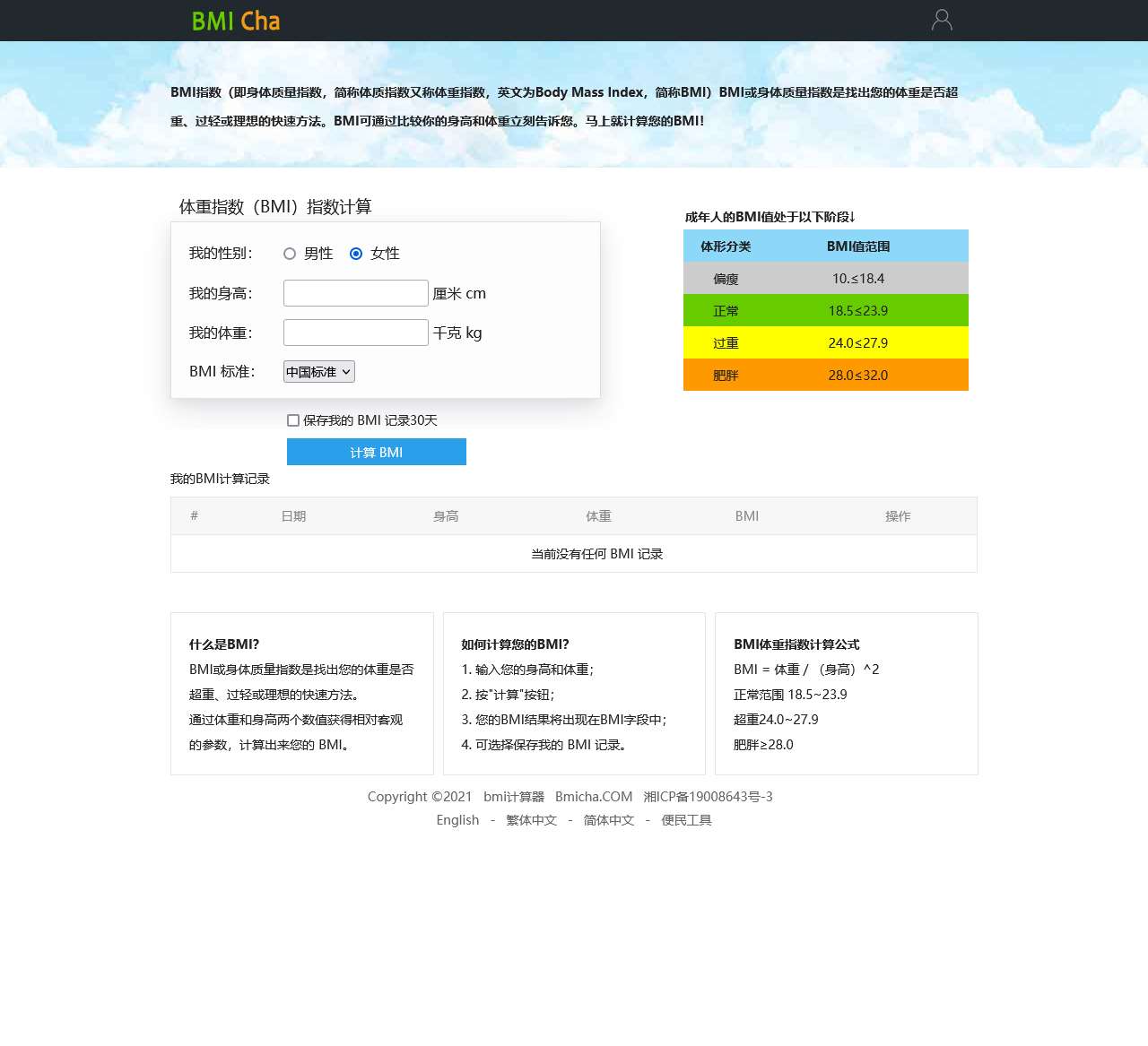 免费计算你的身体质量指数 (BMI). BMI指数(即身体质量指数,简称体质指数又称体重,英文为Body Mass Index,简称BMI)BMI或身体质量指数是找出您的体重是否超重、过轻或理想的快速方法。